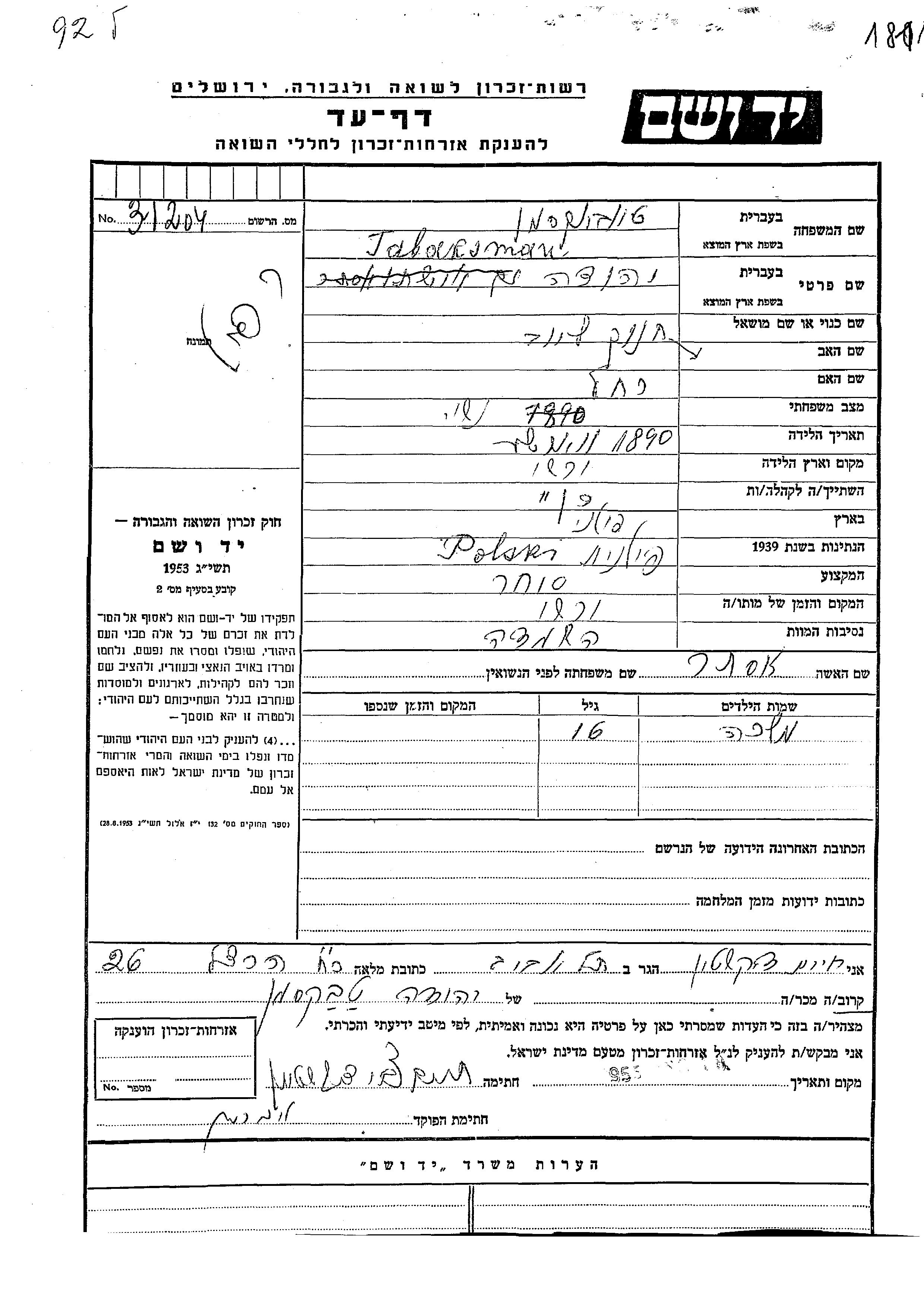 Yad Vashem - Pages of Testimony Names Memorial Collection