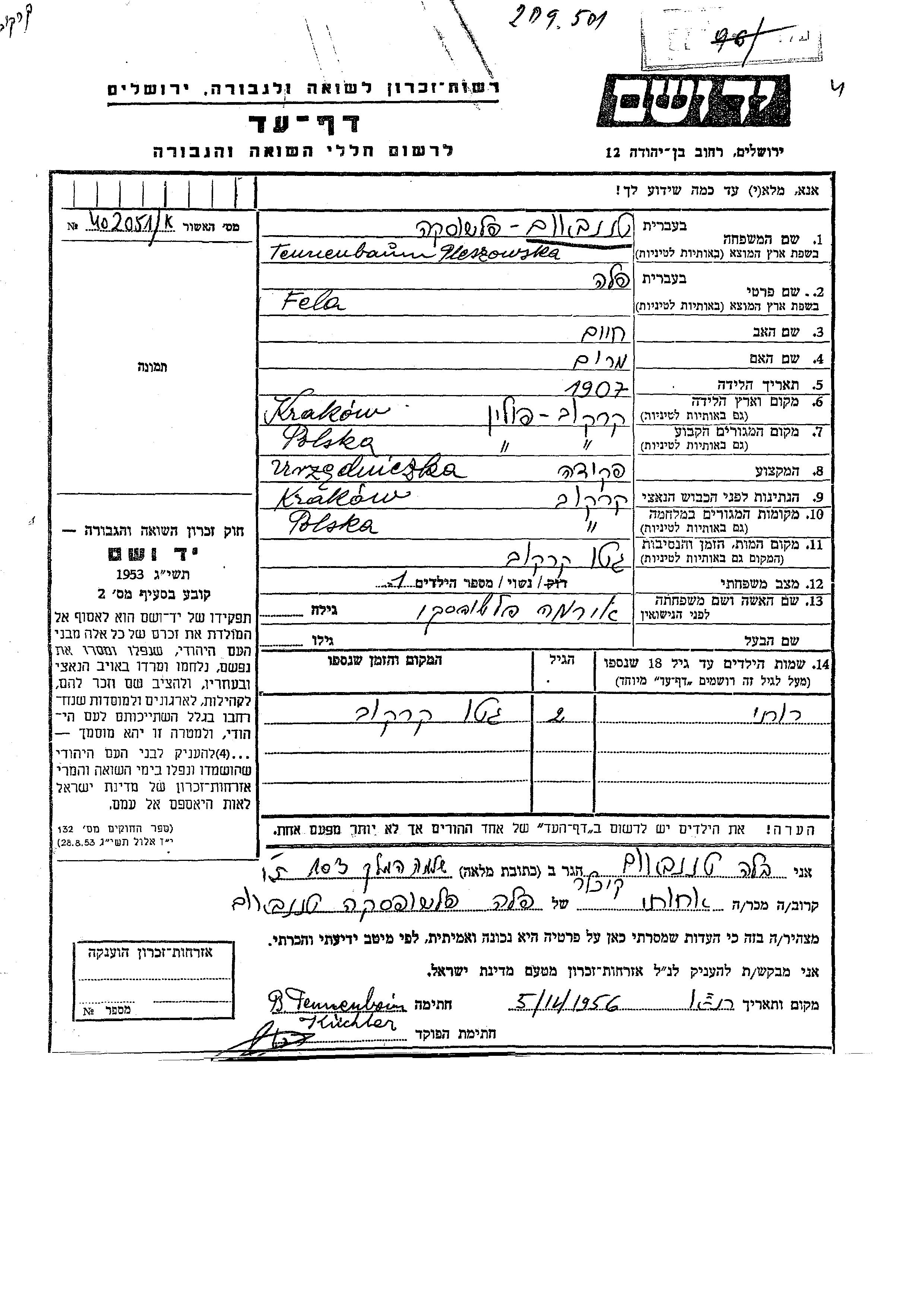 Tennenbaum Ruti Krakow, Pologne Feuille de témoignage
