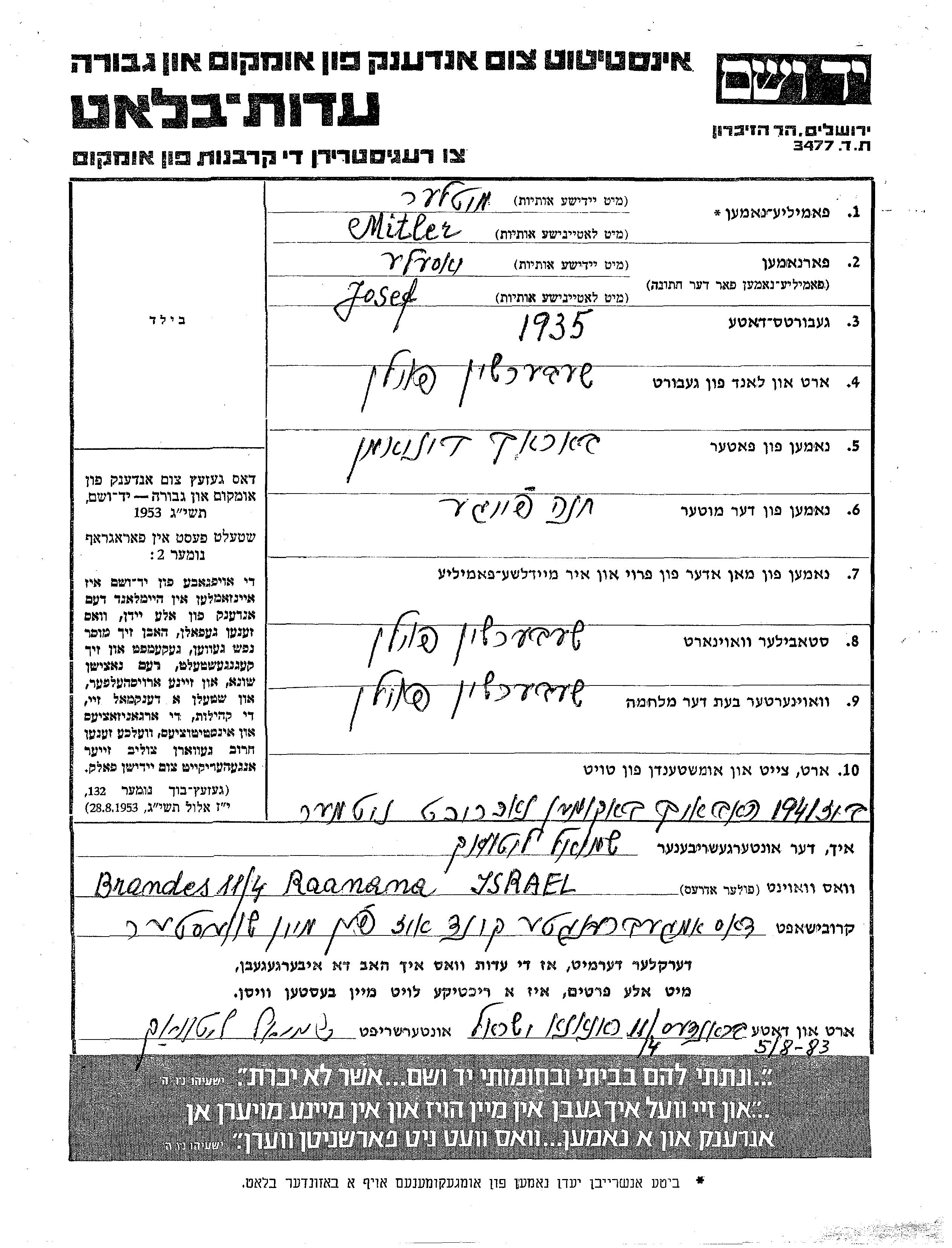 Mitler Josef 1935 Szczebrzeszyn, Pologne Feuille de témoignage