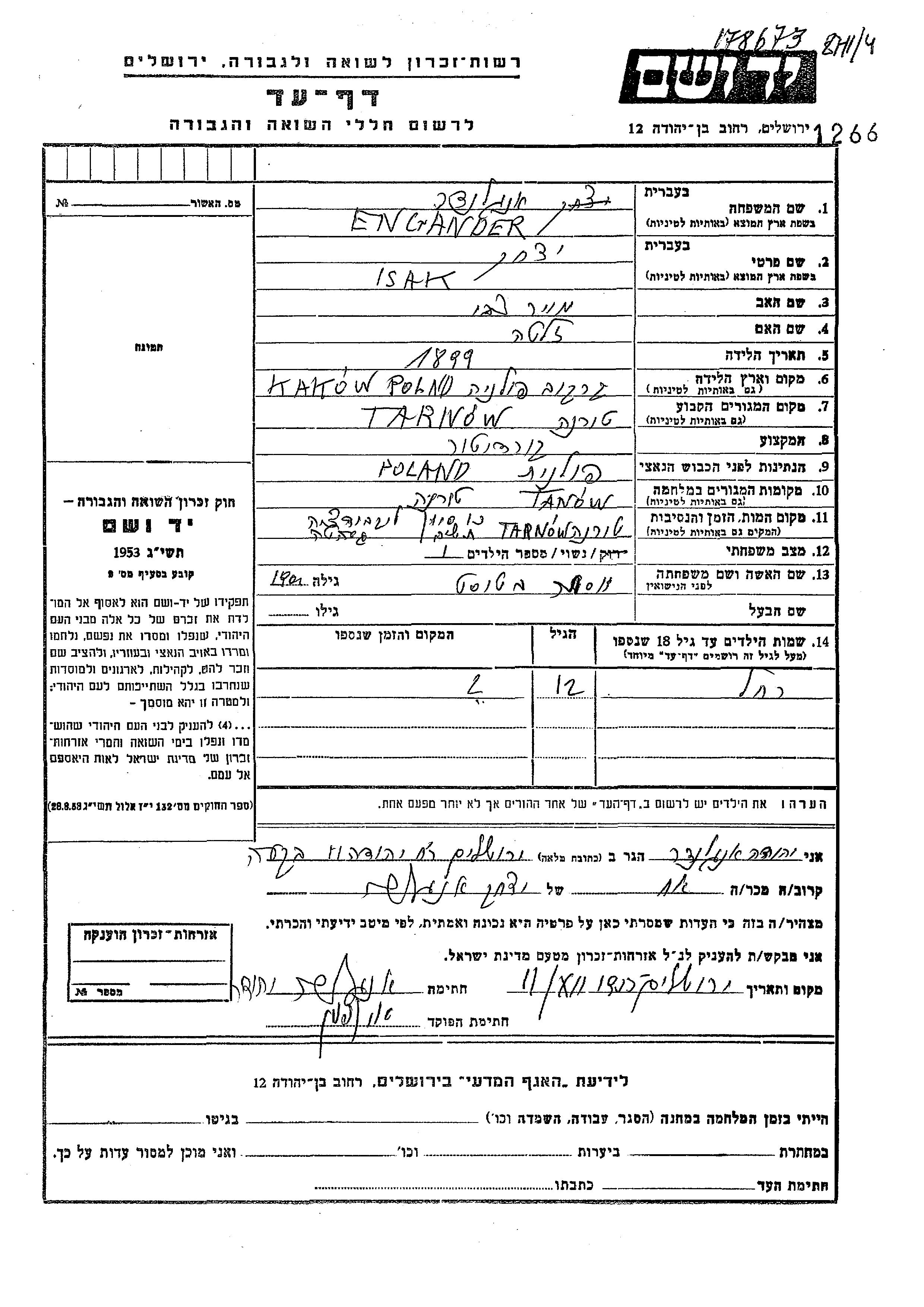 Englander Rakhel Tarnow, Pologne Feuille de témoignage