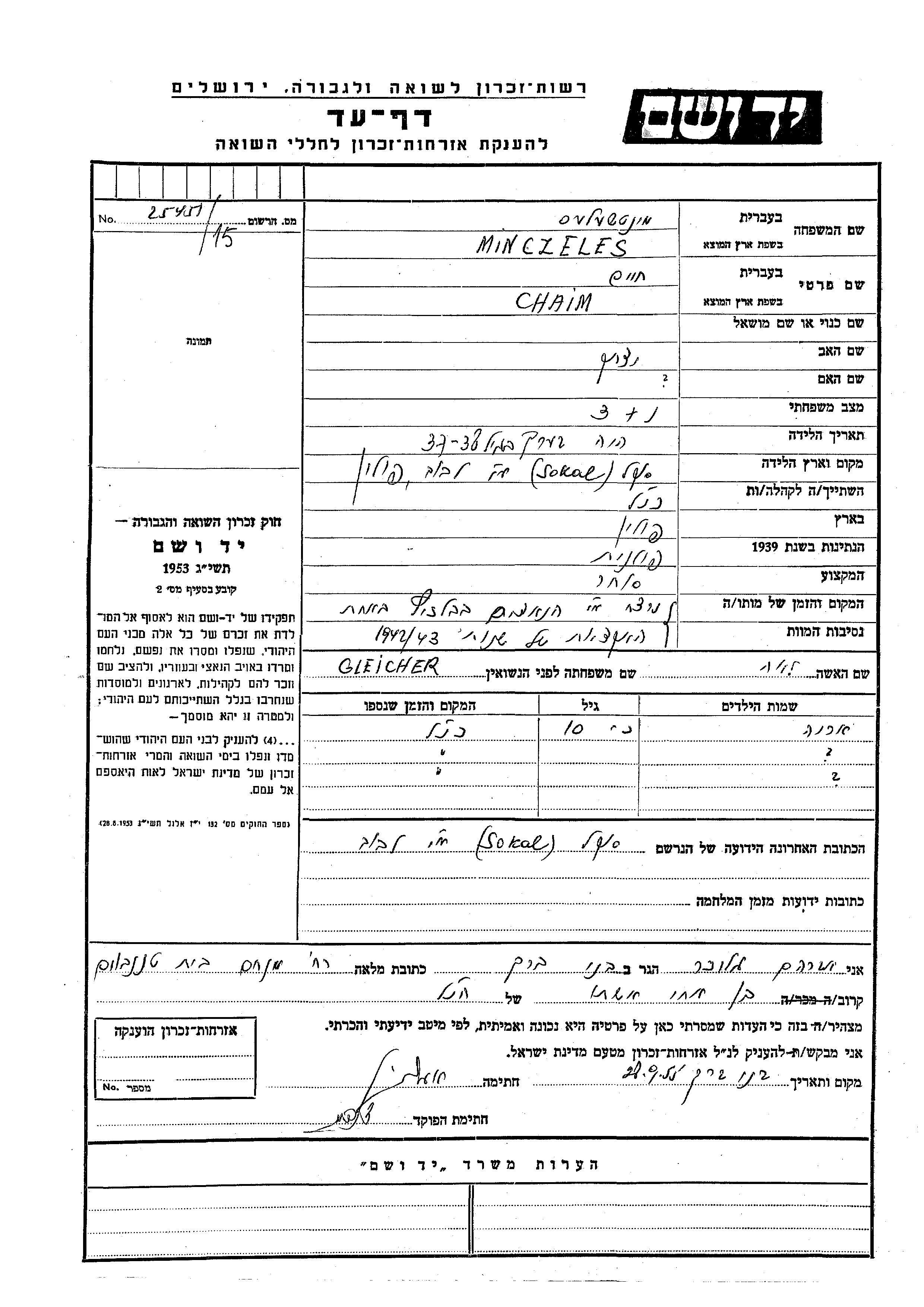 Minczeles Arie endroit inconnu, Feuille de témoignage