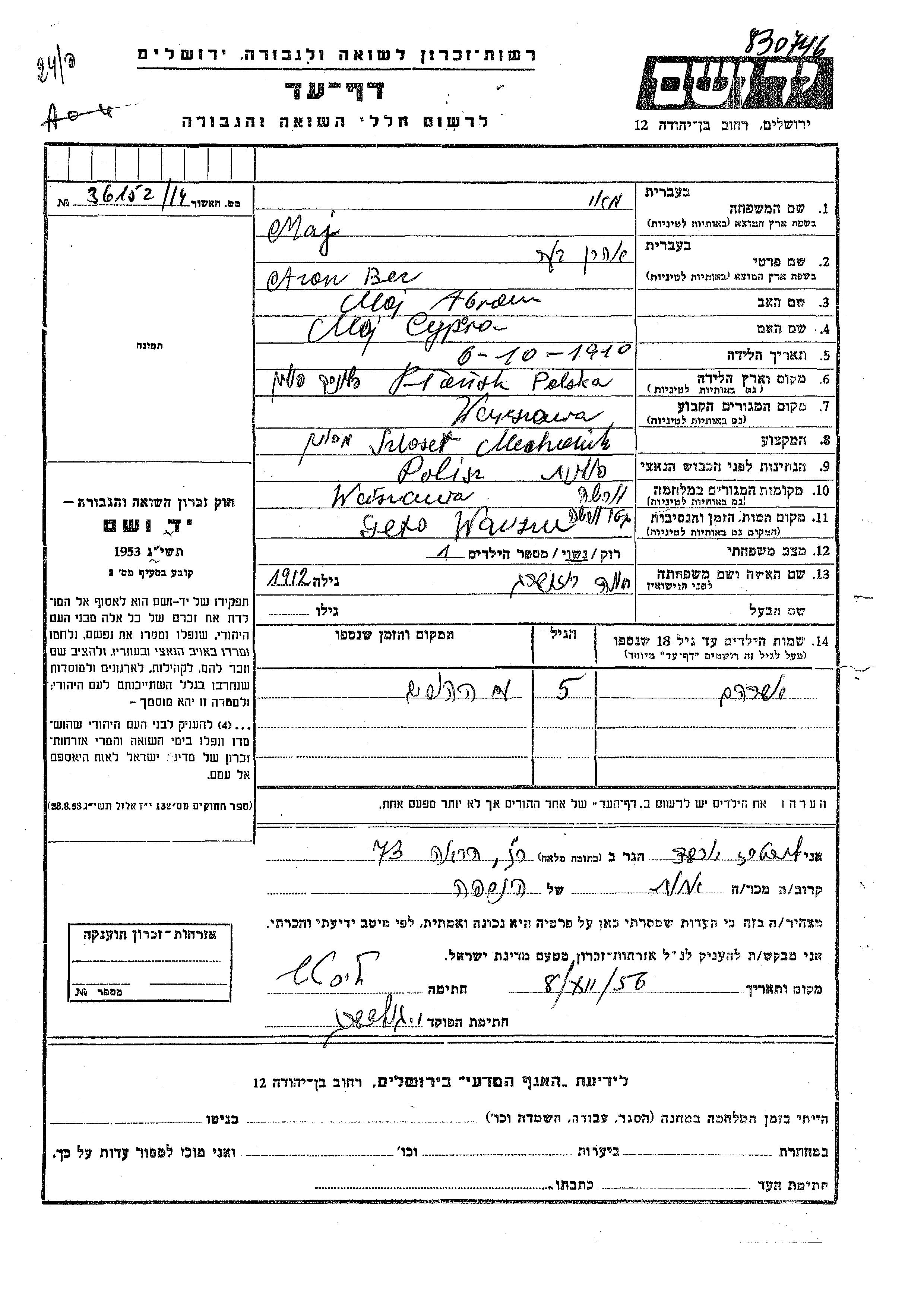 Maj Avraham Warszawa, Pologne Feuille de témoignage