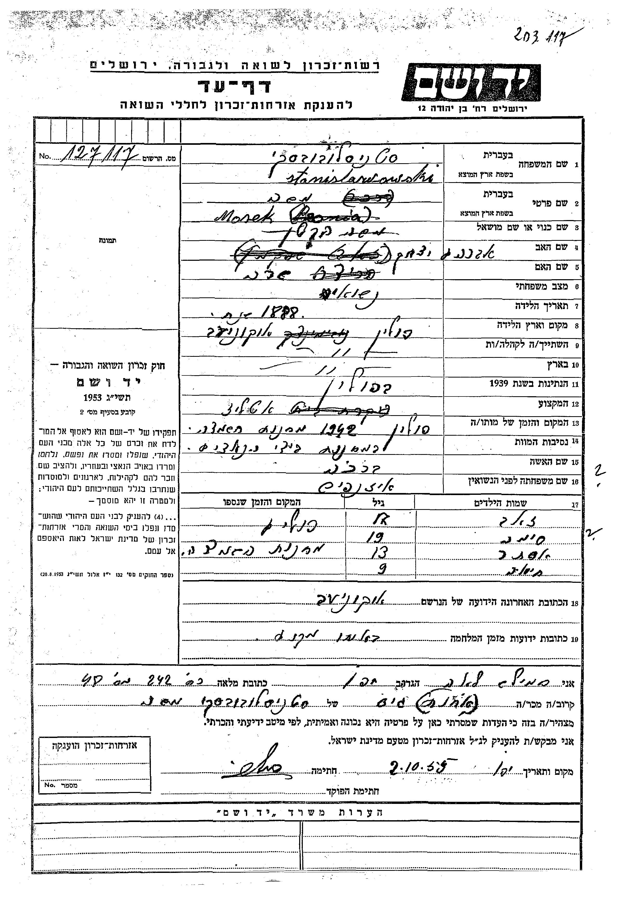 Stanislawowski Khia Okuniew, Pologne Feuille de témoignage
