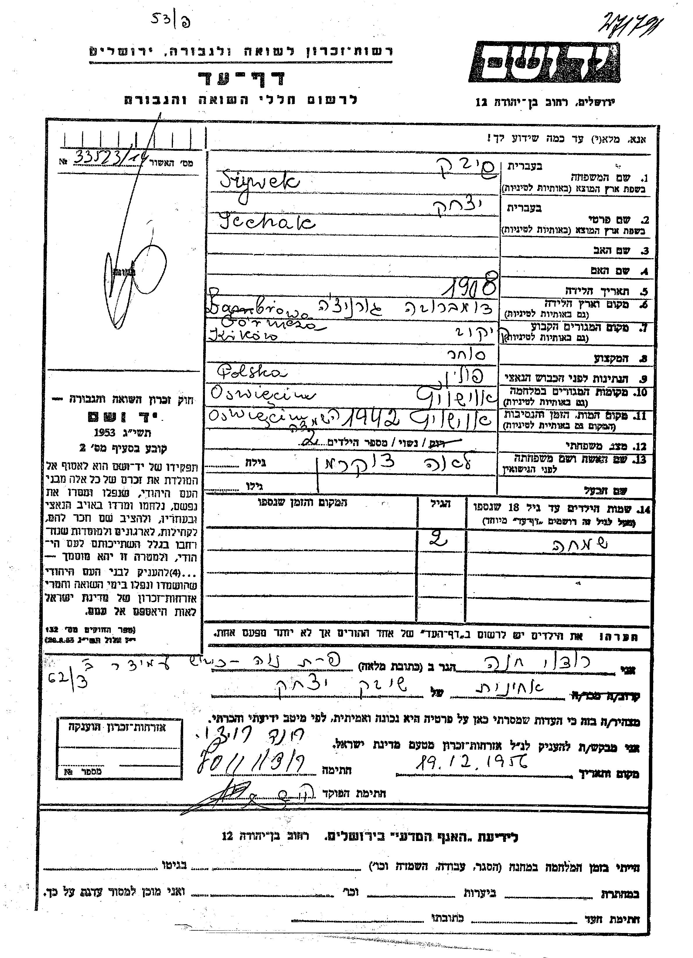 Siywek Shibek Simkha Kikow, Pologne Feuille de témoignage