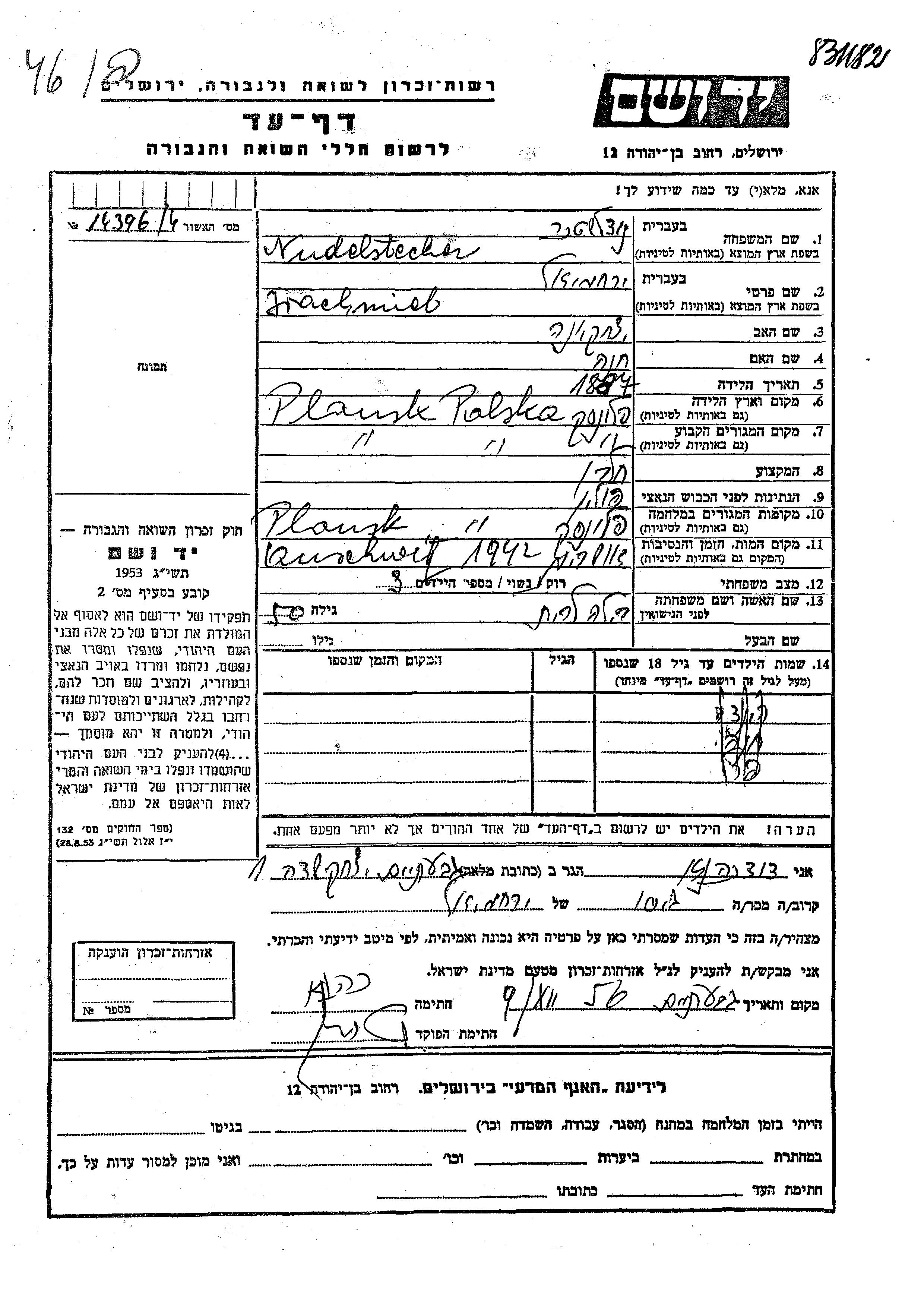 Nudelstecher Perel Plonsk, Pologne Feuille de témoignage