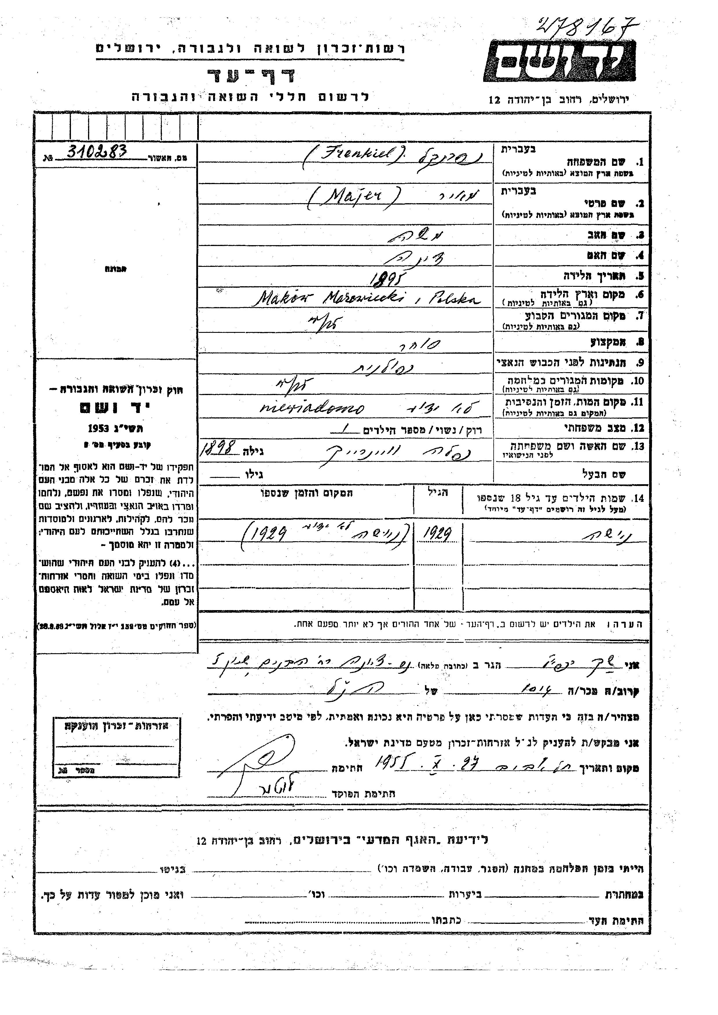 Frenkiel Niusha 1929 Makow Mazowiecki, Pologne Feuille de témoignage