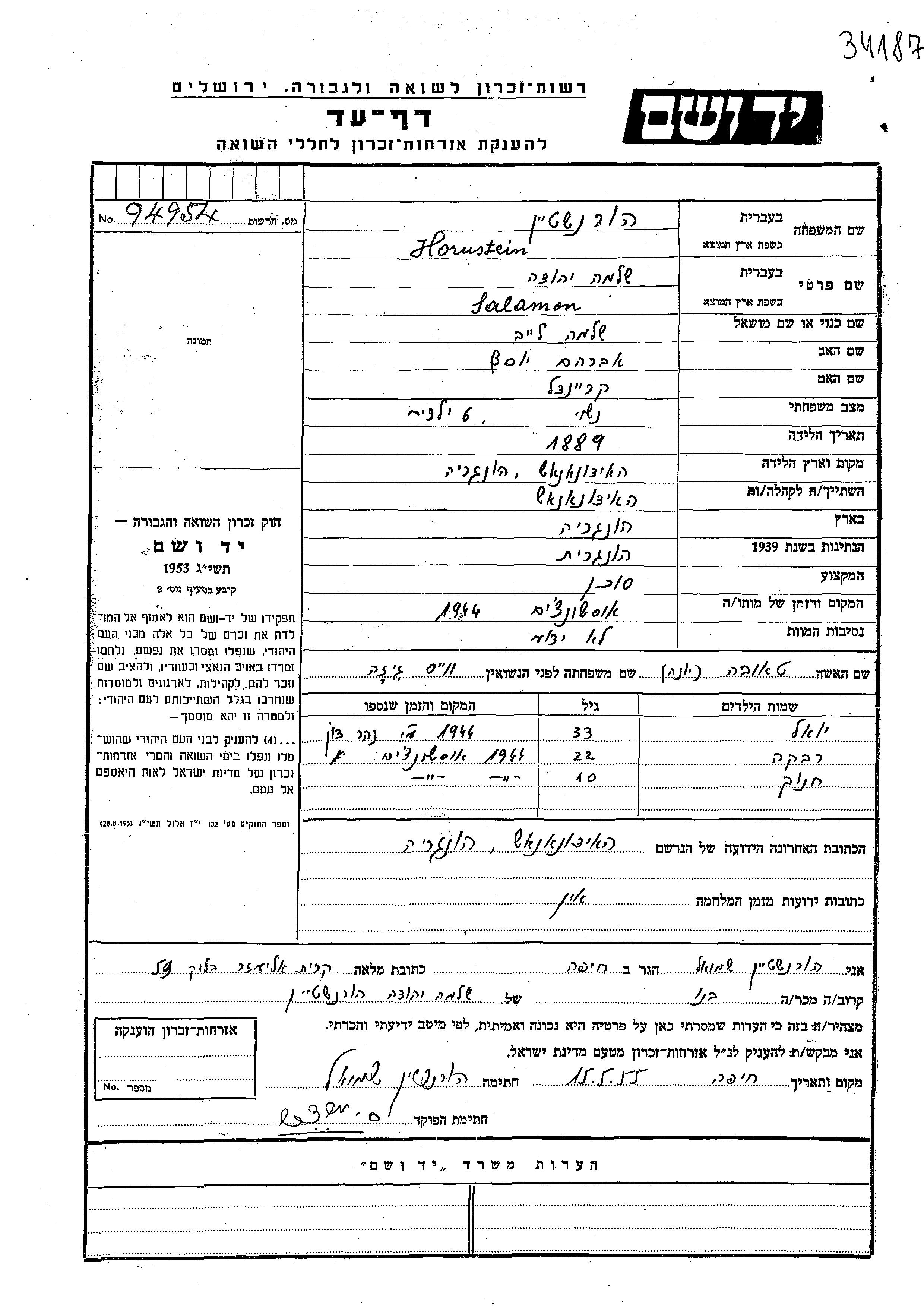 Hornstein Yoel Hajdunanas, Hongrie Feuille de témoignage