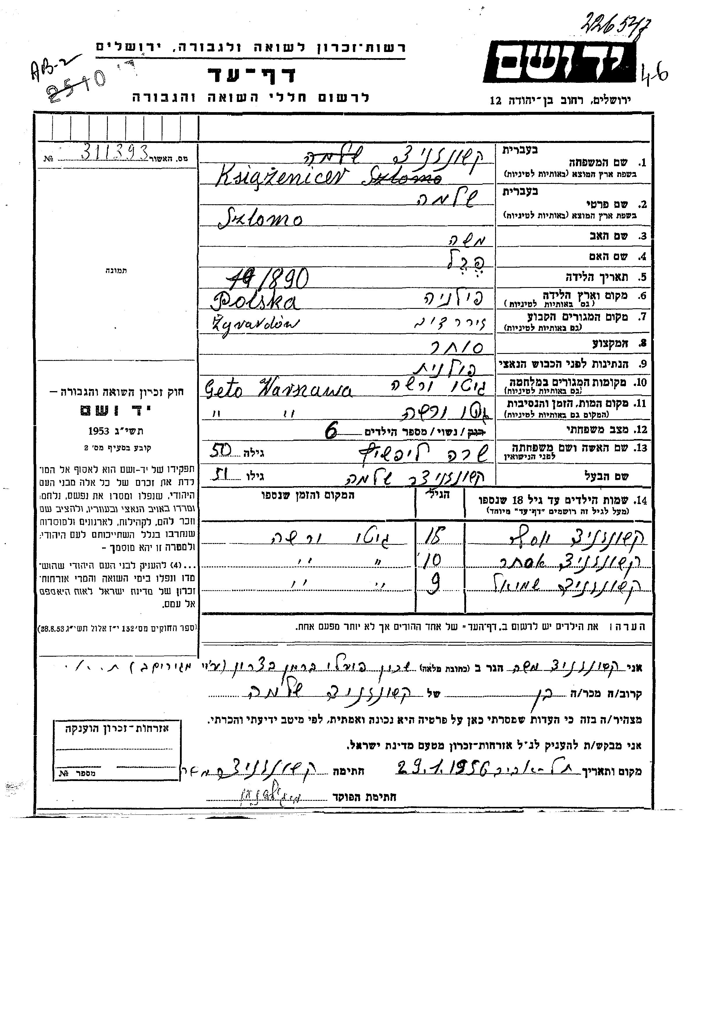 Ksiazenicer Yosef Zyrardow, Pologne Feuille de témoignage