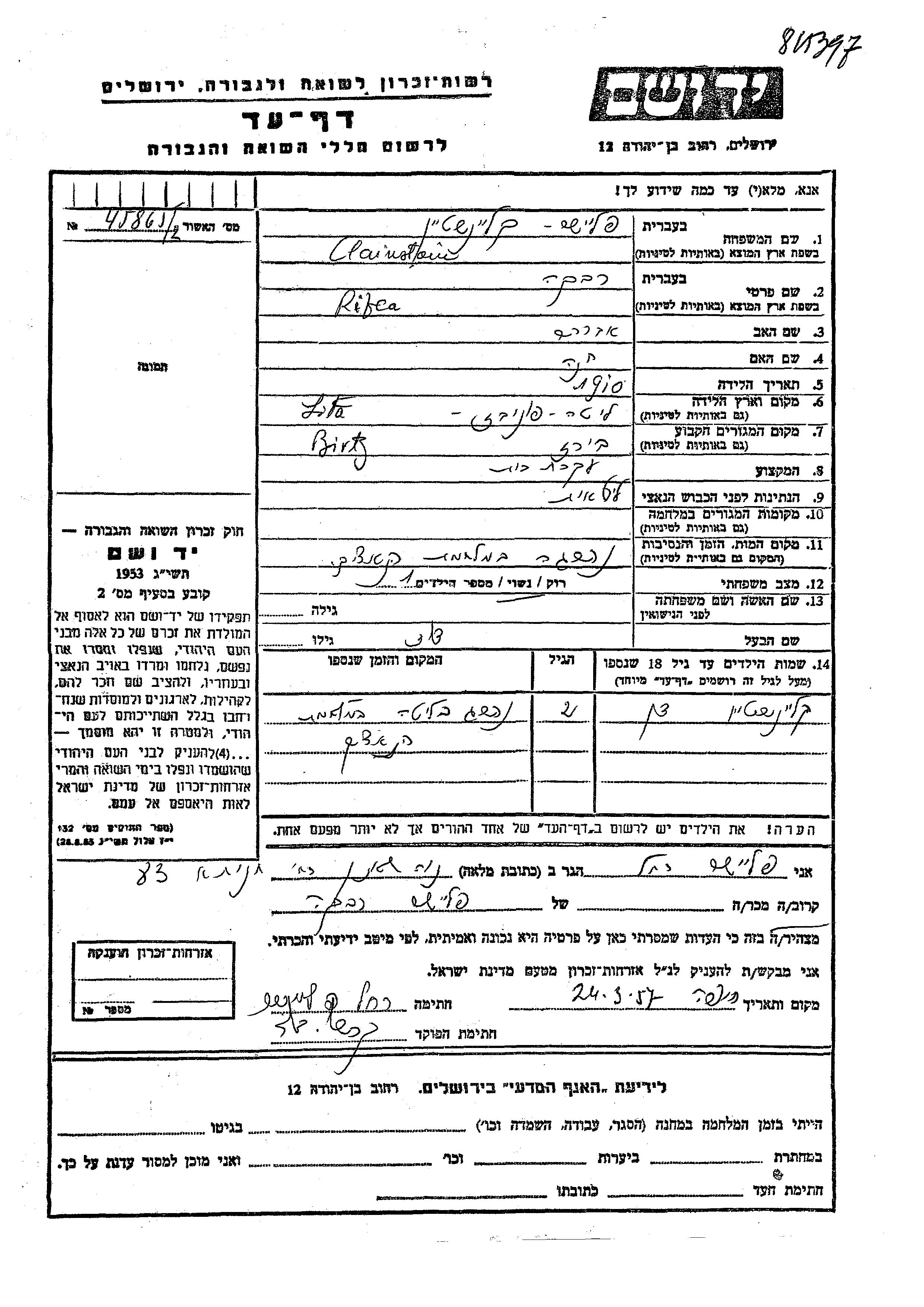 Yad Vashem - Pages of Testimony Names Memorial Collection