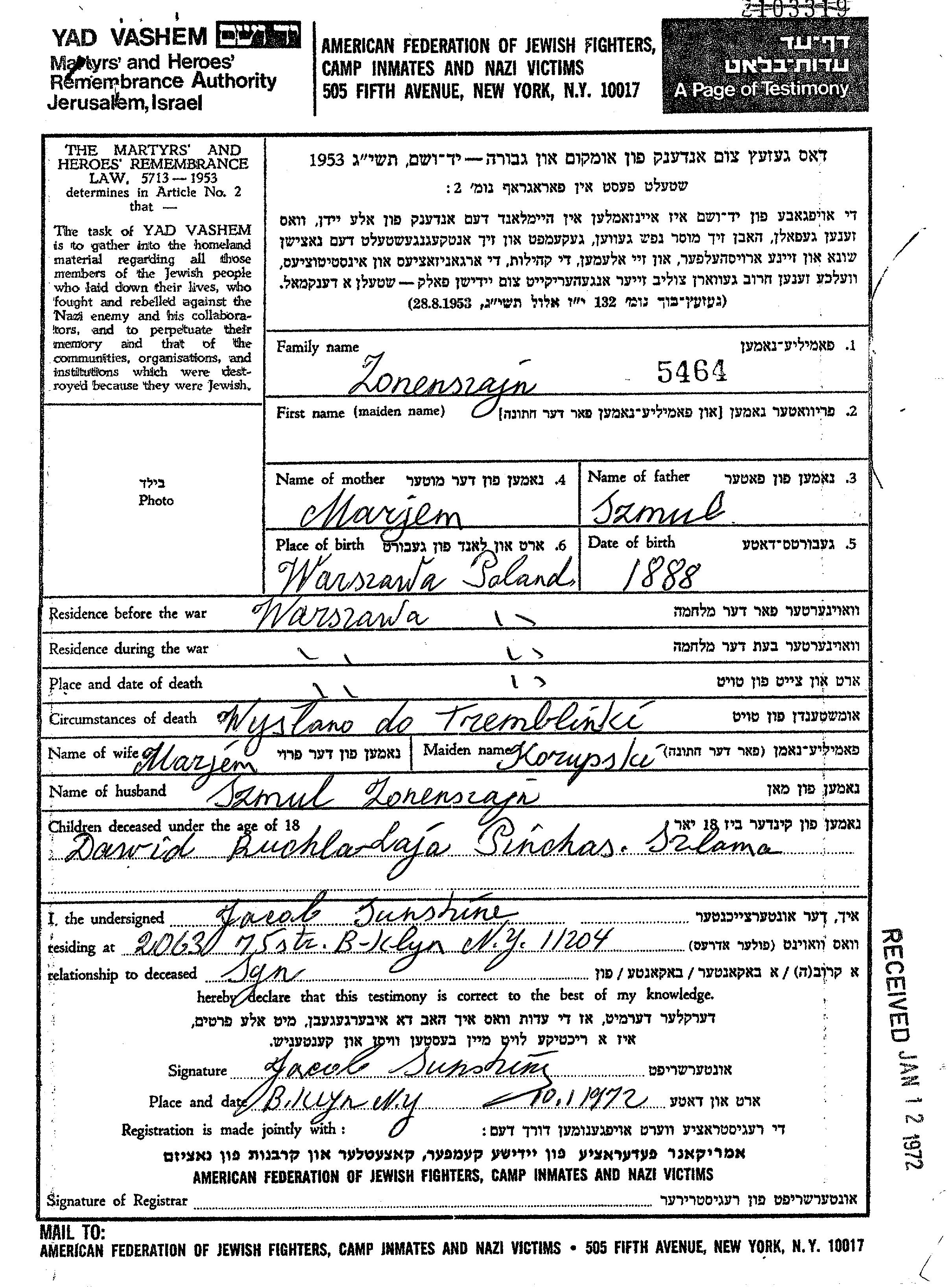 Pinchas Zonenszajn est né fils de Marjem née Korupski. Il était Enfant. Avant la seconde guerre mondiale il vivait à Warszawa, Pologne. Au cours de la guerre, il était à Warszawa, Pologne.