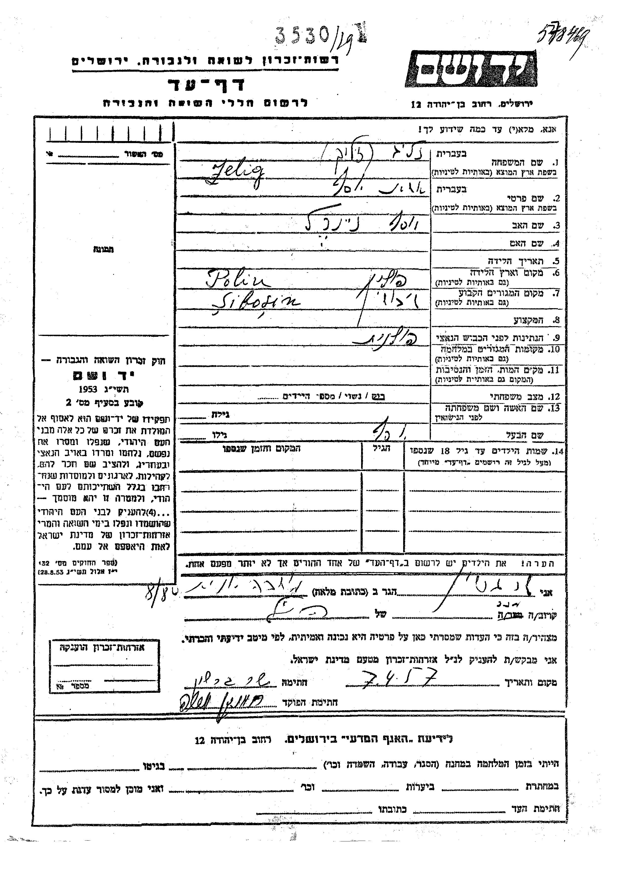 prénom inconnu Zelig est né à Pologne, fils de Yosef. Il était Mariée à Yosef née Neinudel. Avant la seconde guerre mondiale il vivait à Sibosin, Pologne.