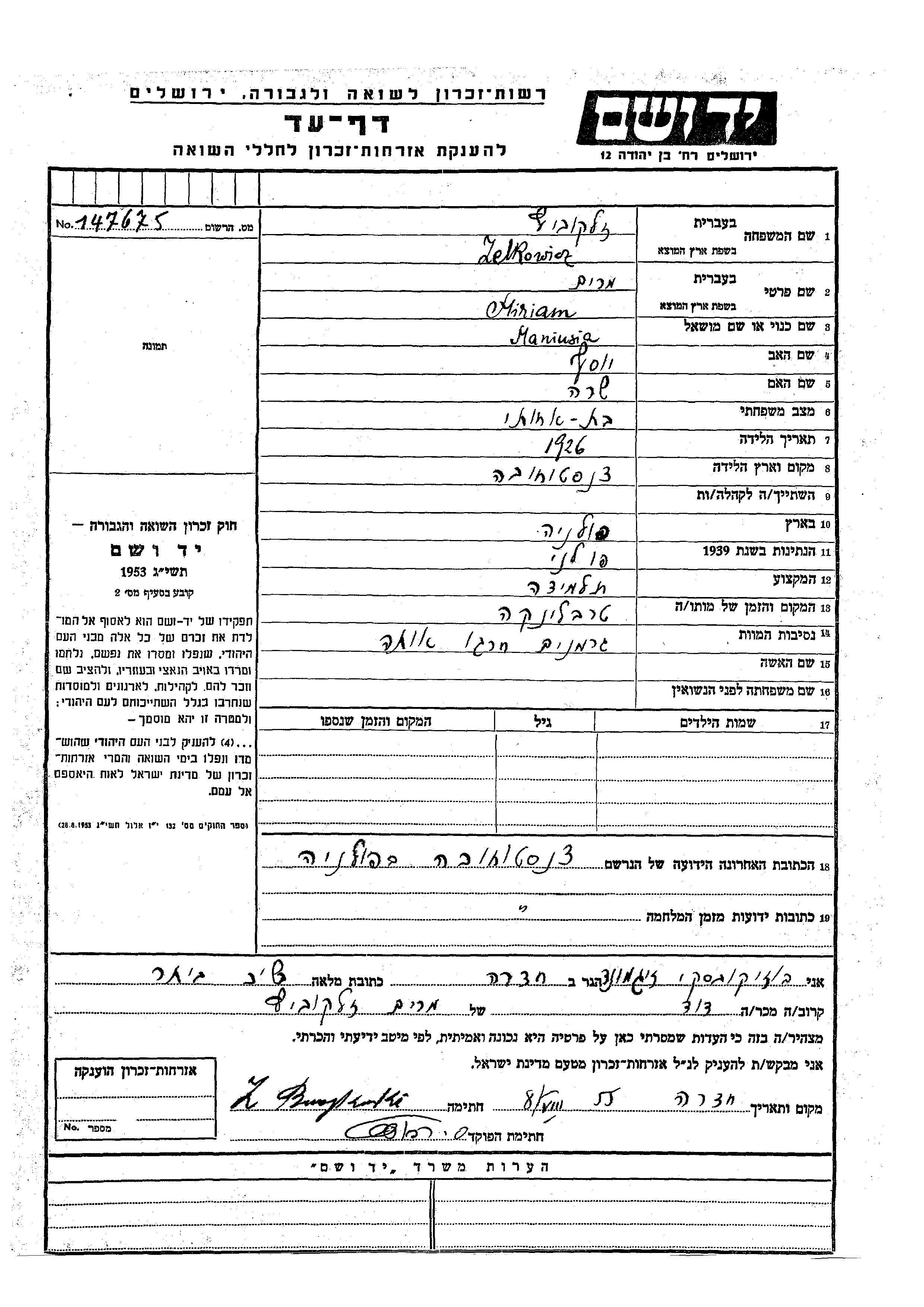 Miriam Zelkowicz est née à Chenstochov, Pologne en 1926, fille de Yosef et de Sara. Elle était Élève. Avant la seconde guerre mondiale elle vivait à Chenstchov, Pologne. Pendant la guerre, elle était à Chenstchov, Pologne.
