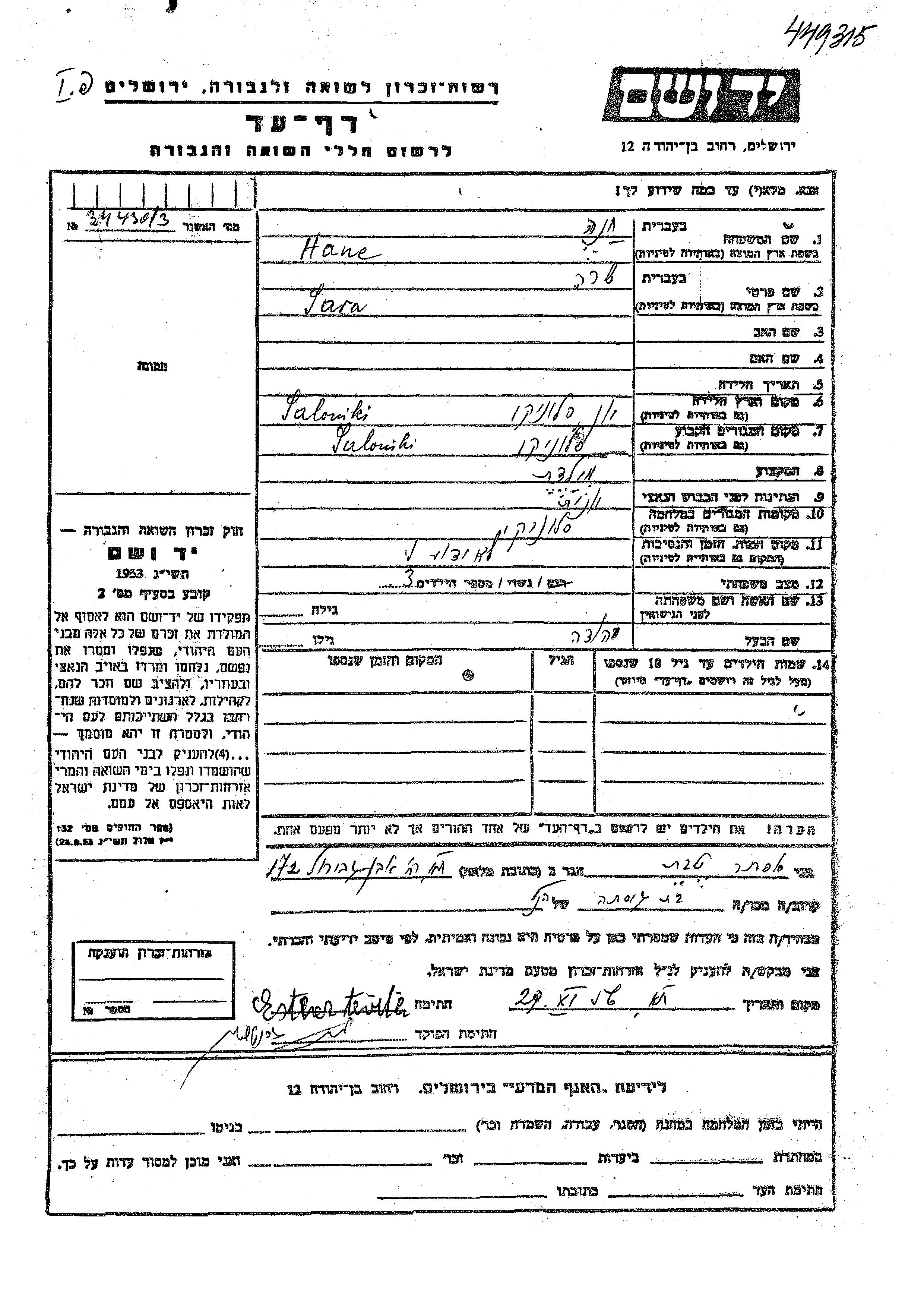 Hane Sara Saloniki, Grèce Feuille de témoignage