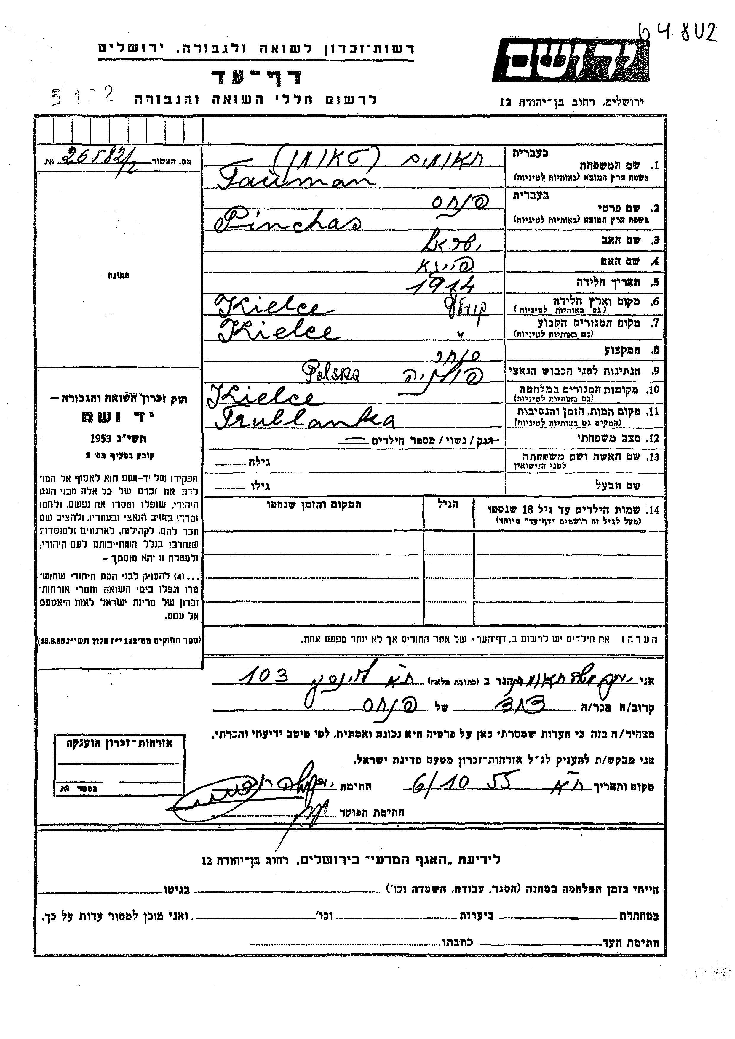 Tauman Teomim Pinchas 1914 Kielce, Pologne Feuille de témoignage