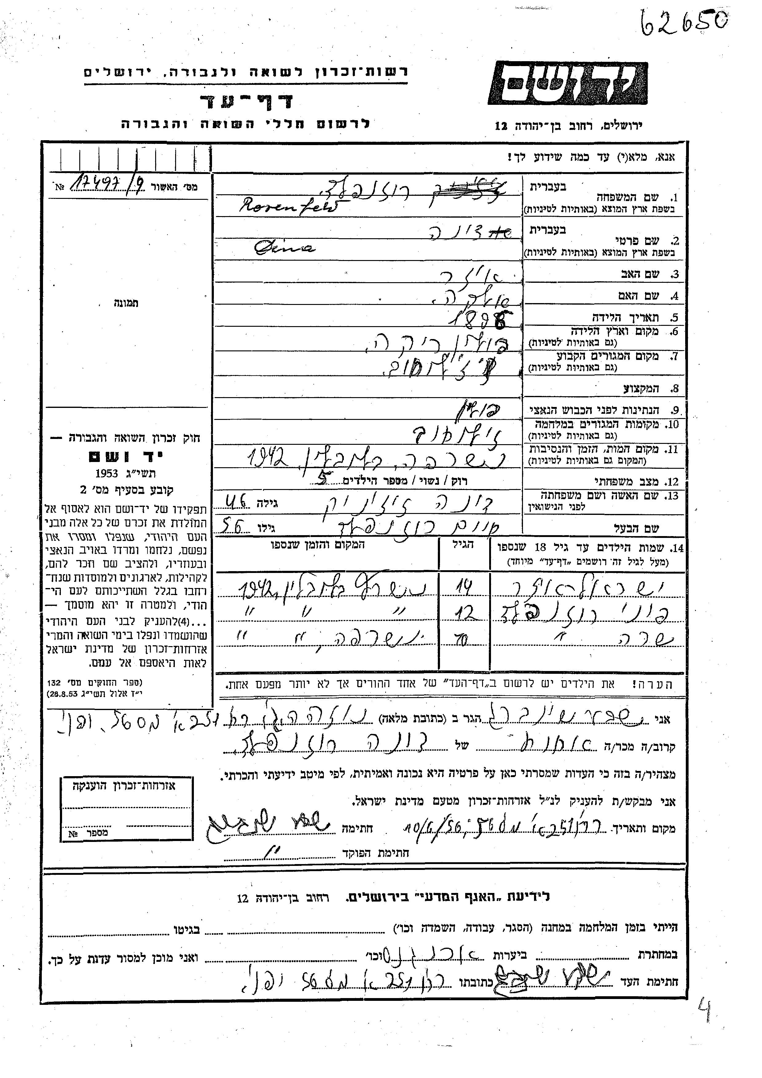 Yisrael Ozer Rosenfeld est né fils de Khaim et de Dina née Zheznik. Il était Enfant. Avant la seconde guerre mondiale il vivait à Zelechow, Pologne. Au cours de la guerre, il était à Zelechow, Pologne.