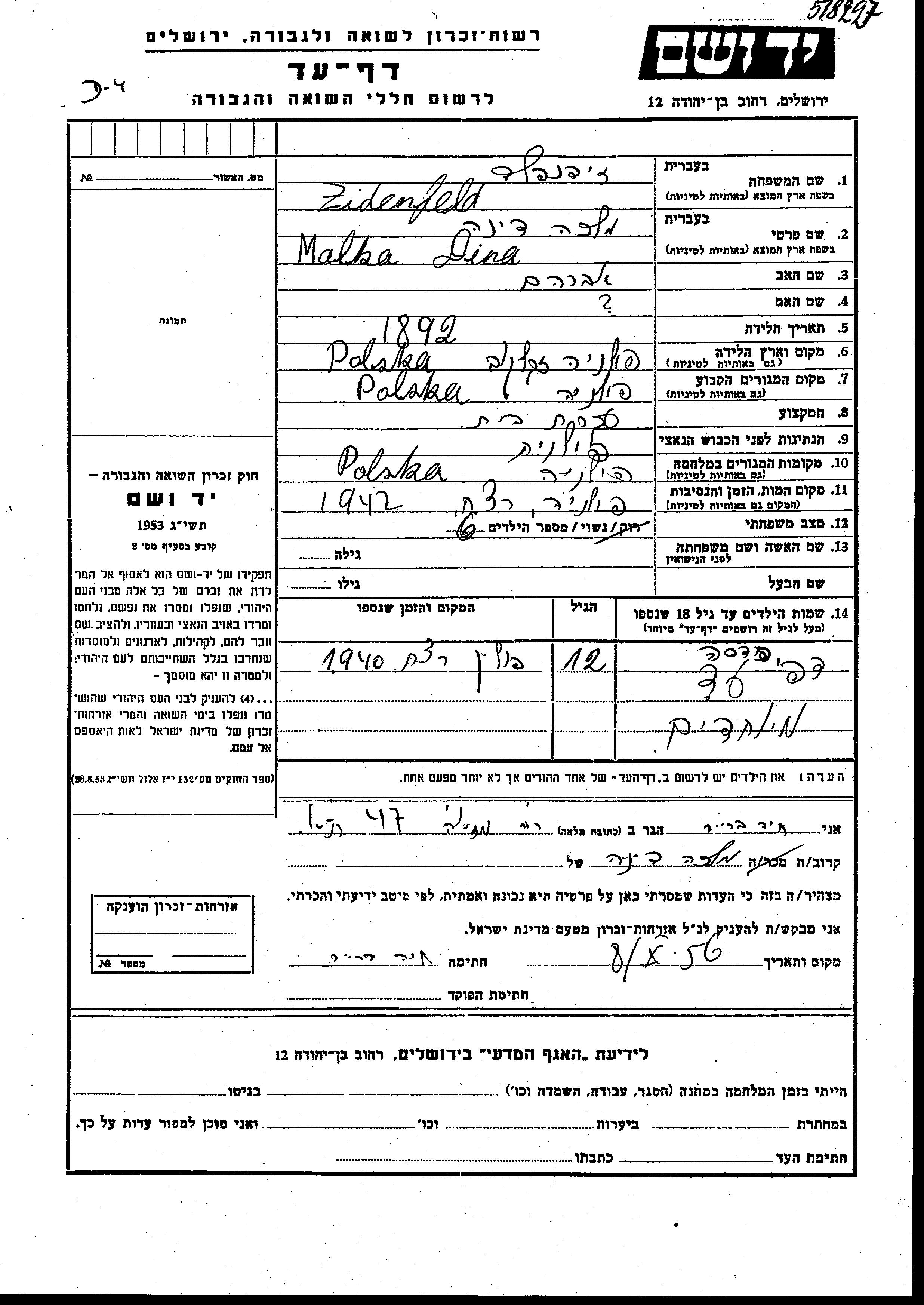 Hadasa Zidenfeld est née fille de Malka Dina. Elle était Enfant. Avant la seconde guerre mondiale elle vivait à Pologne. Pendant la guerre, elle était à Pologne.
