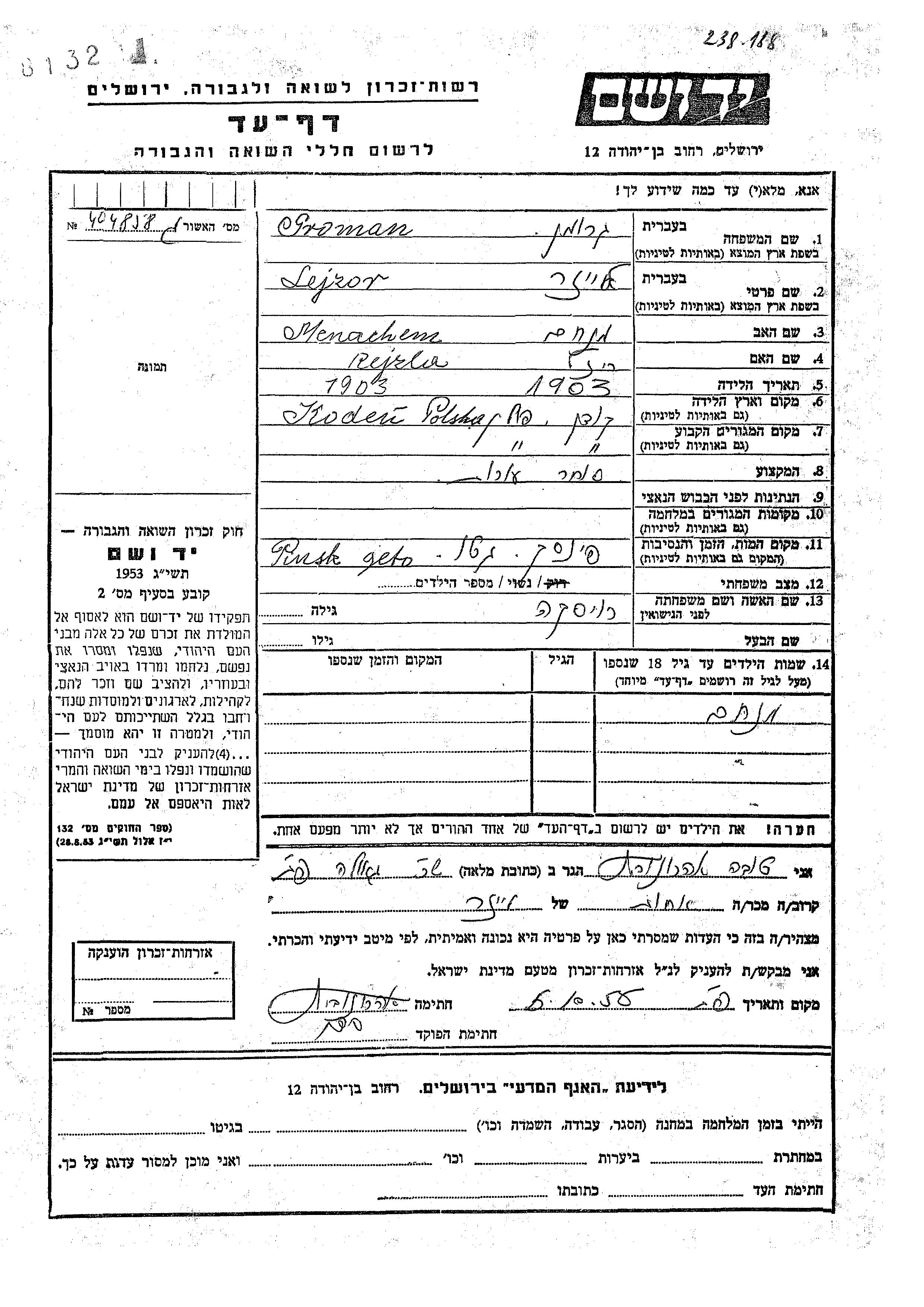 Yad Vashem - Pages of Testimony Names Memorial Collection
