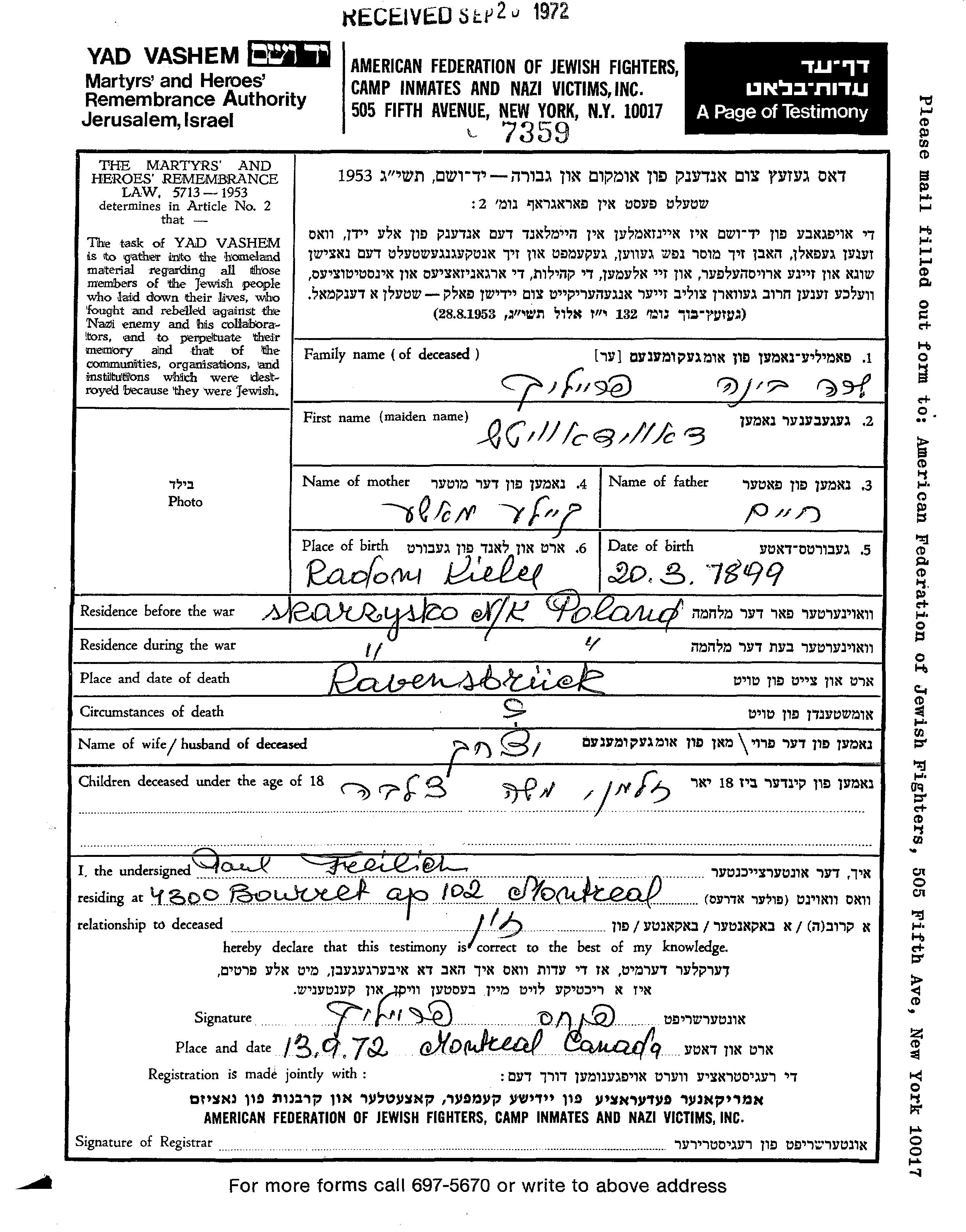 Freilikh Zalman Skarzysko Kamienna, Pologne Feuille de témoignage