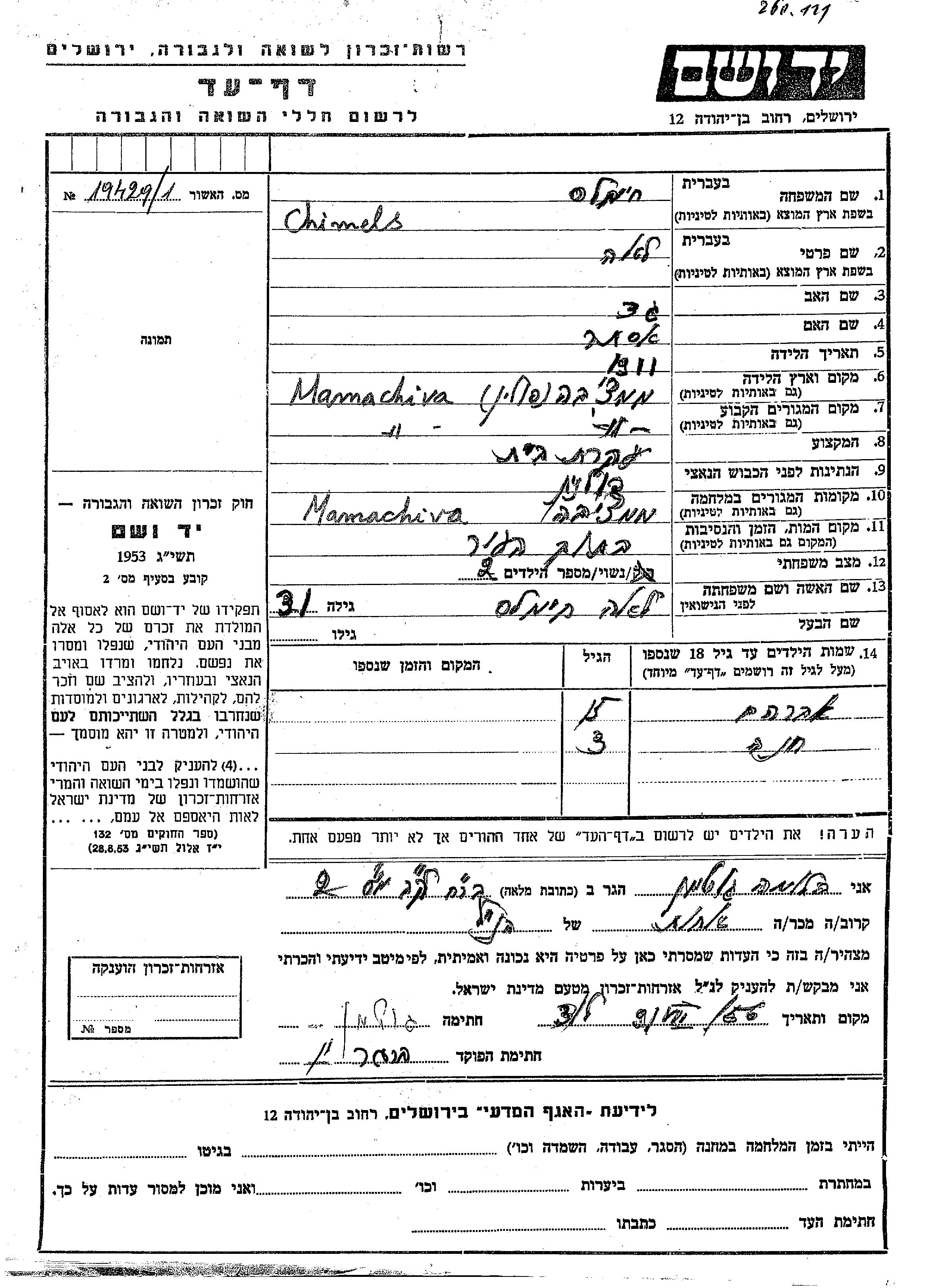 Chimels Khana Mamachive, Pologne Feuille de témoignage