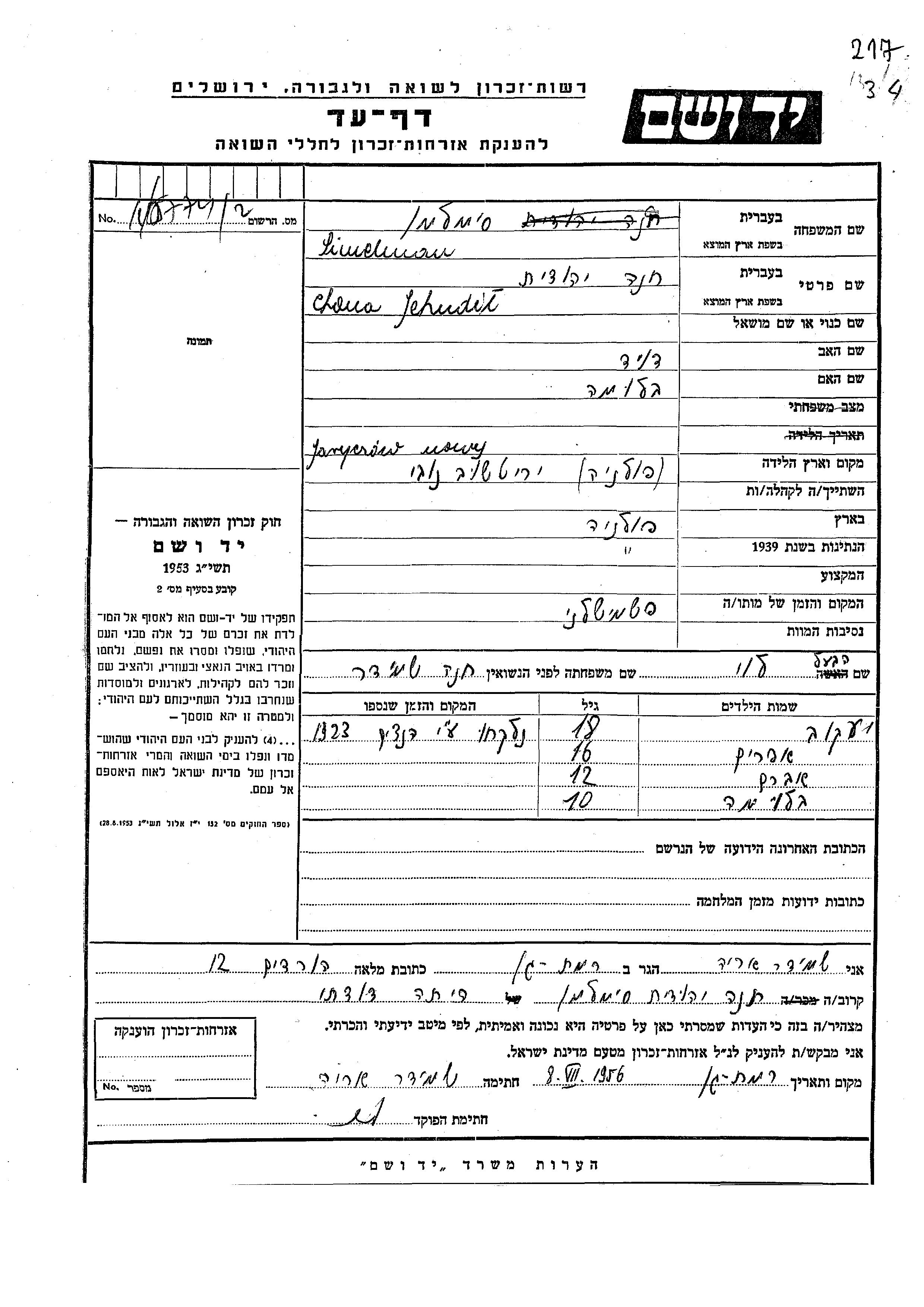 Yad Vashem - Pages of Testimony Names Memorial Collection