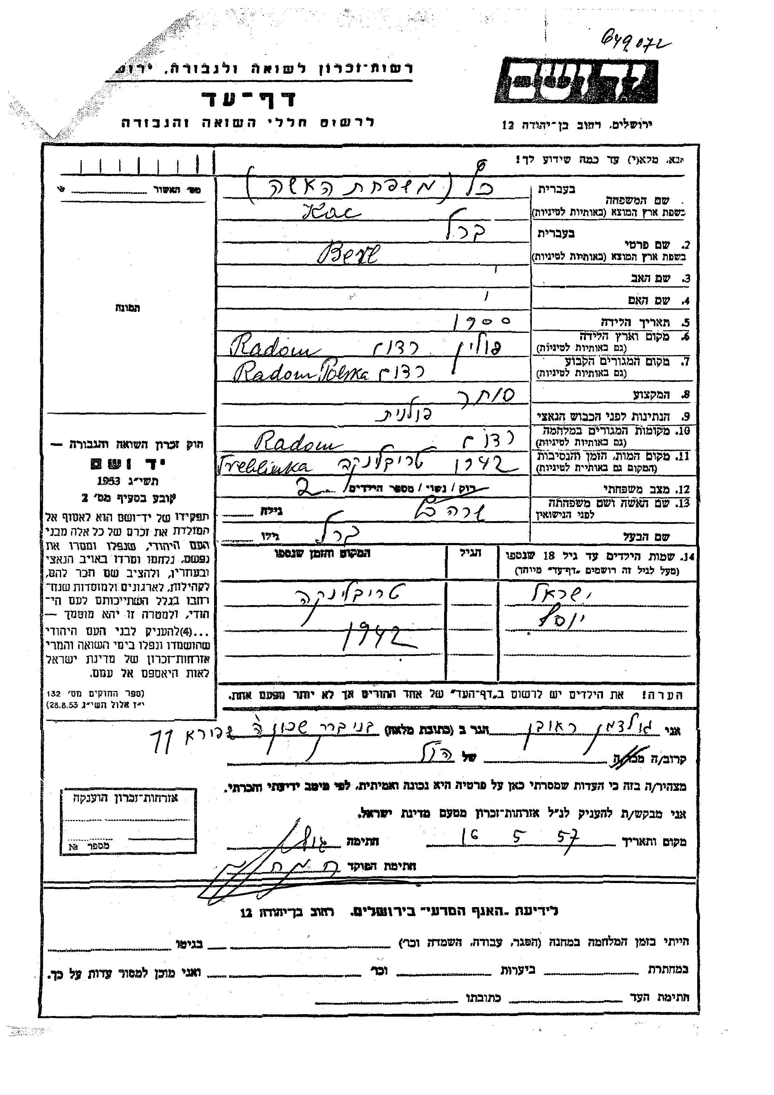nom inconnu Yisrael Radom, Pologne Feuille de témoignage