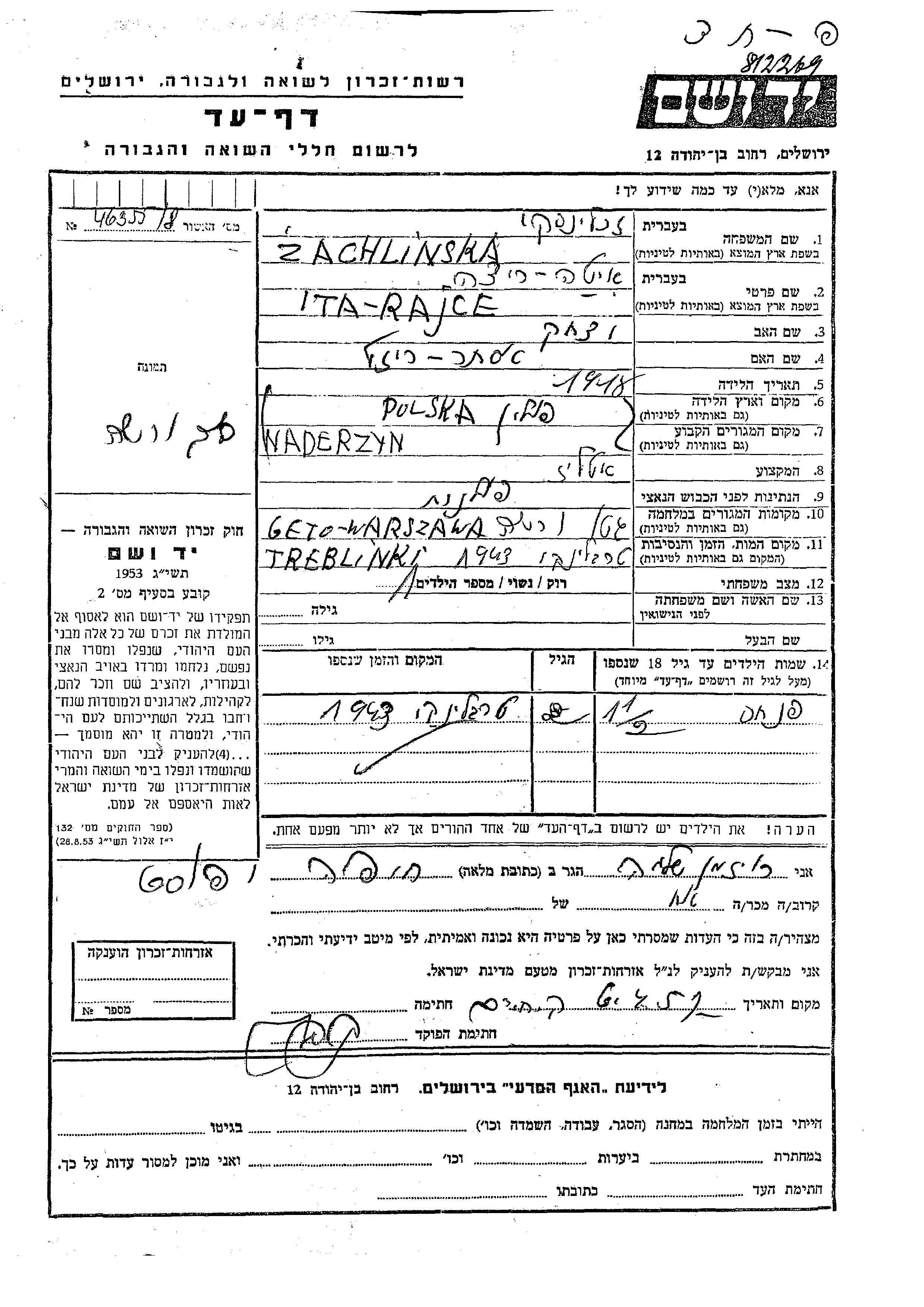 Zachlinska Pinkhas Nadarzyn, Pologne Feuille de témoignage
