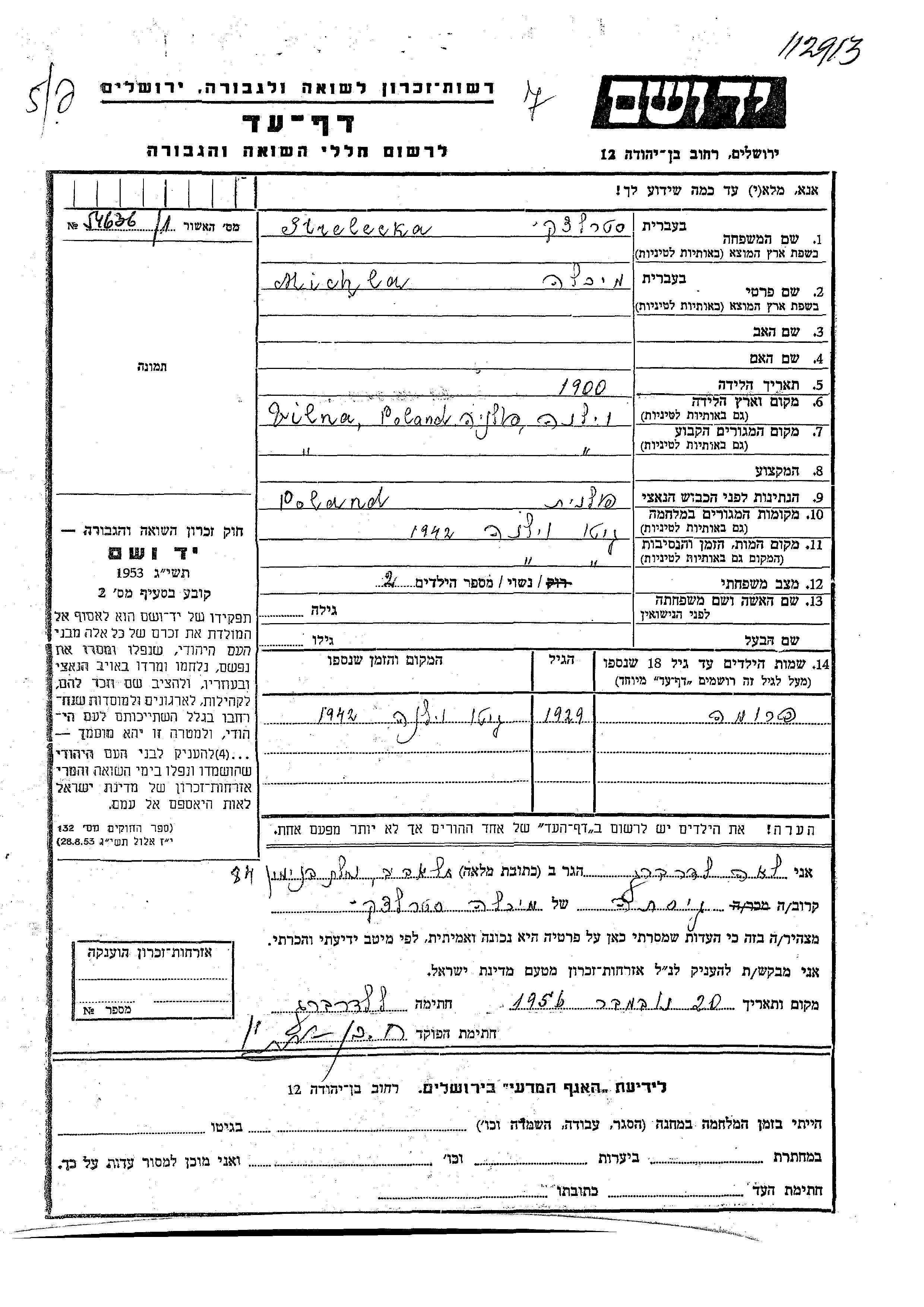 Strelecki Fruma Vilna, Pologne Feuille de témoignage