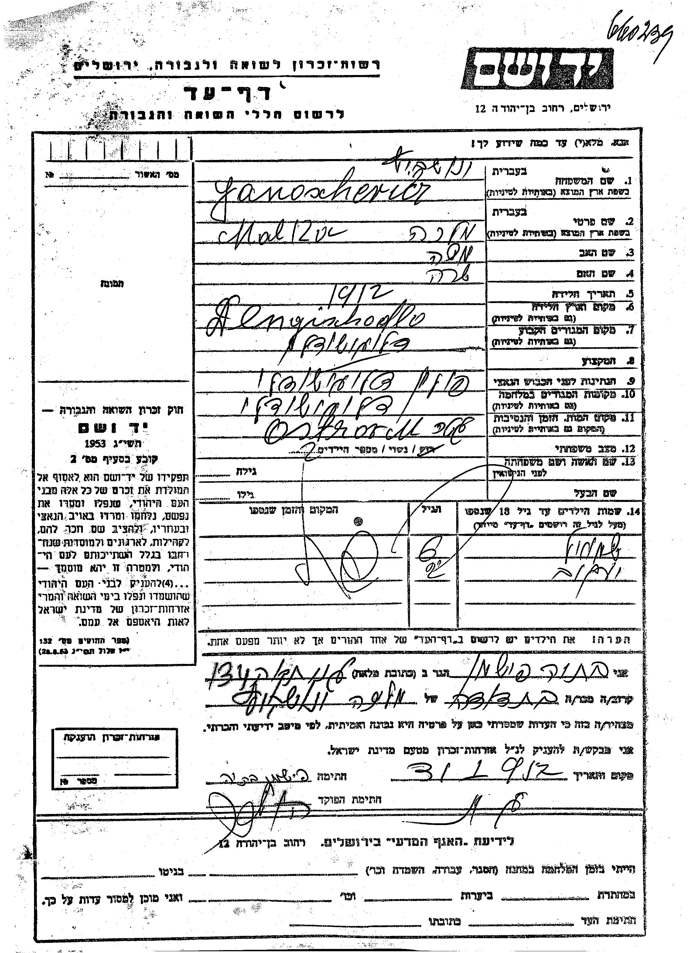 Yanoschevicz Shmuel Dlugosiodlo, Pologne Feuille de témoignage