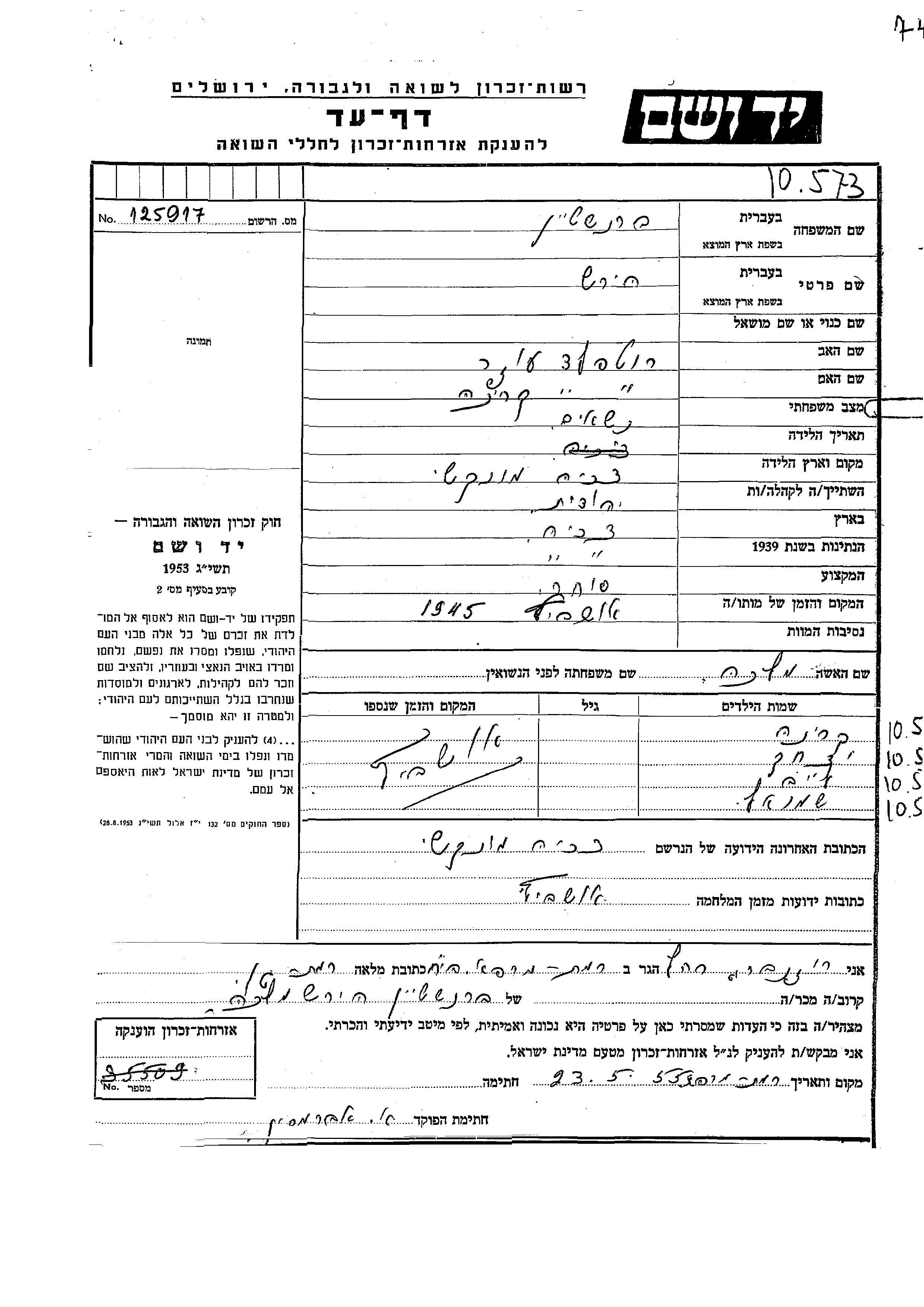 Branshtein Rotfeld Leib Munkacs, Tchécoslovaquie Feuille de témoignage