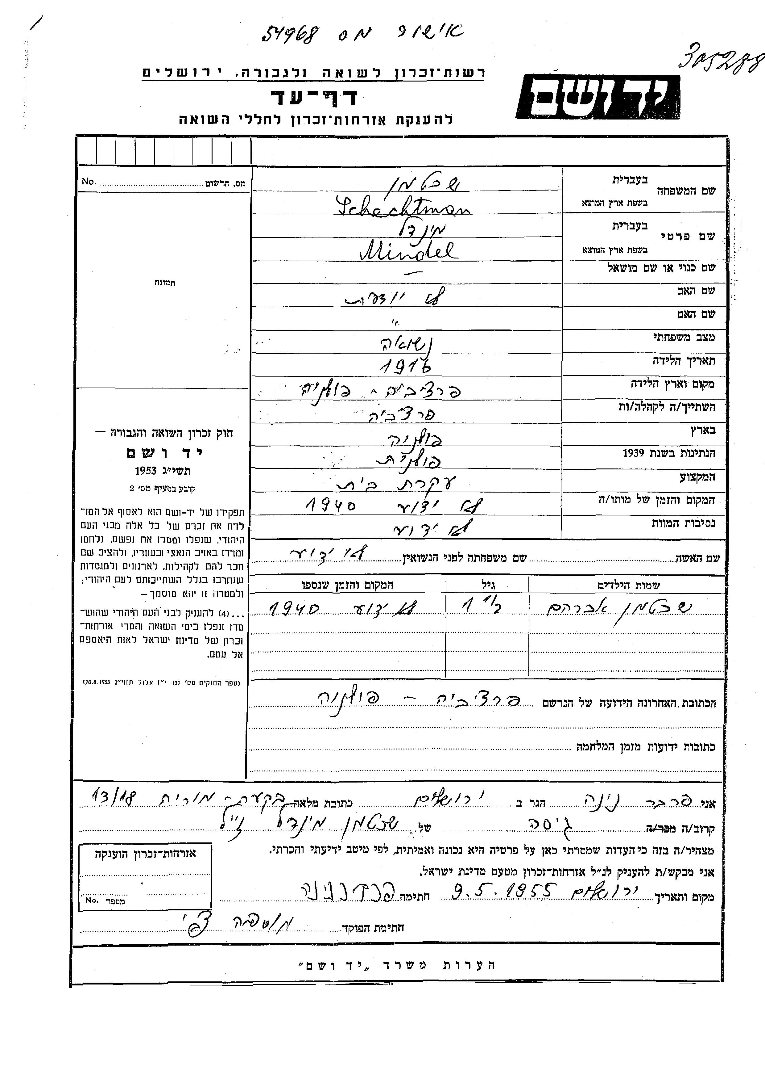 Schechtman Avraham Parczew, Pologne Feuille de témoignage