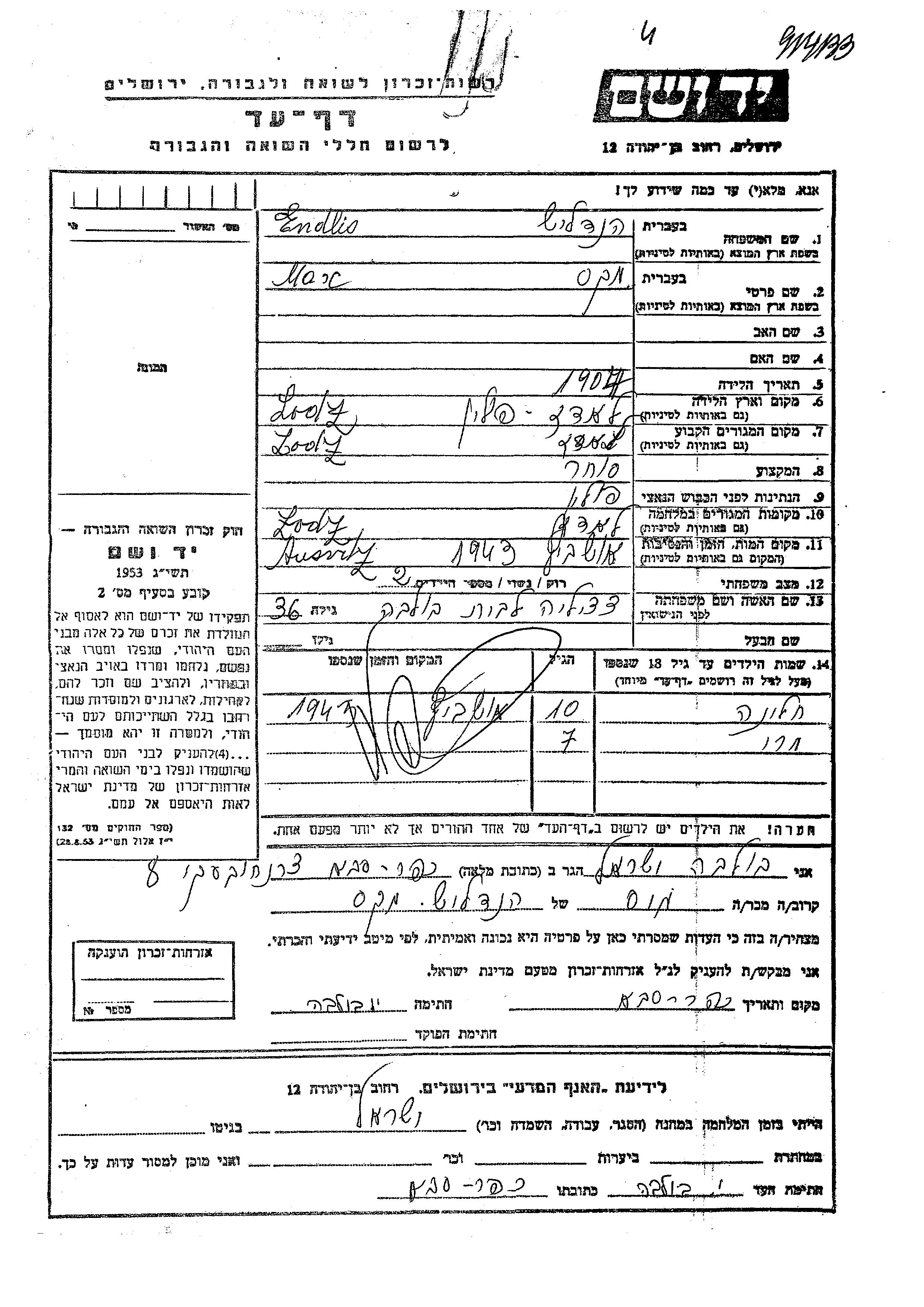 Endlis Hendlish Mari Lodz, Pologne Feuille de témoignage