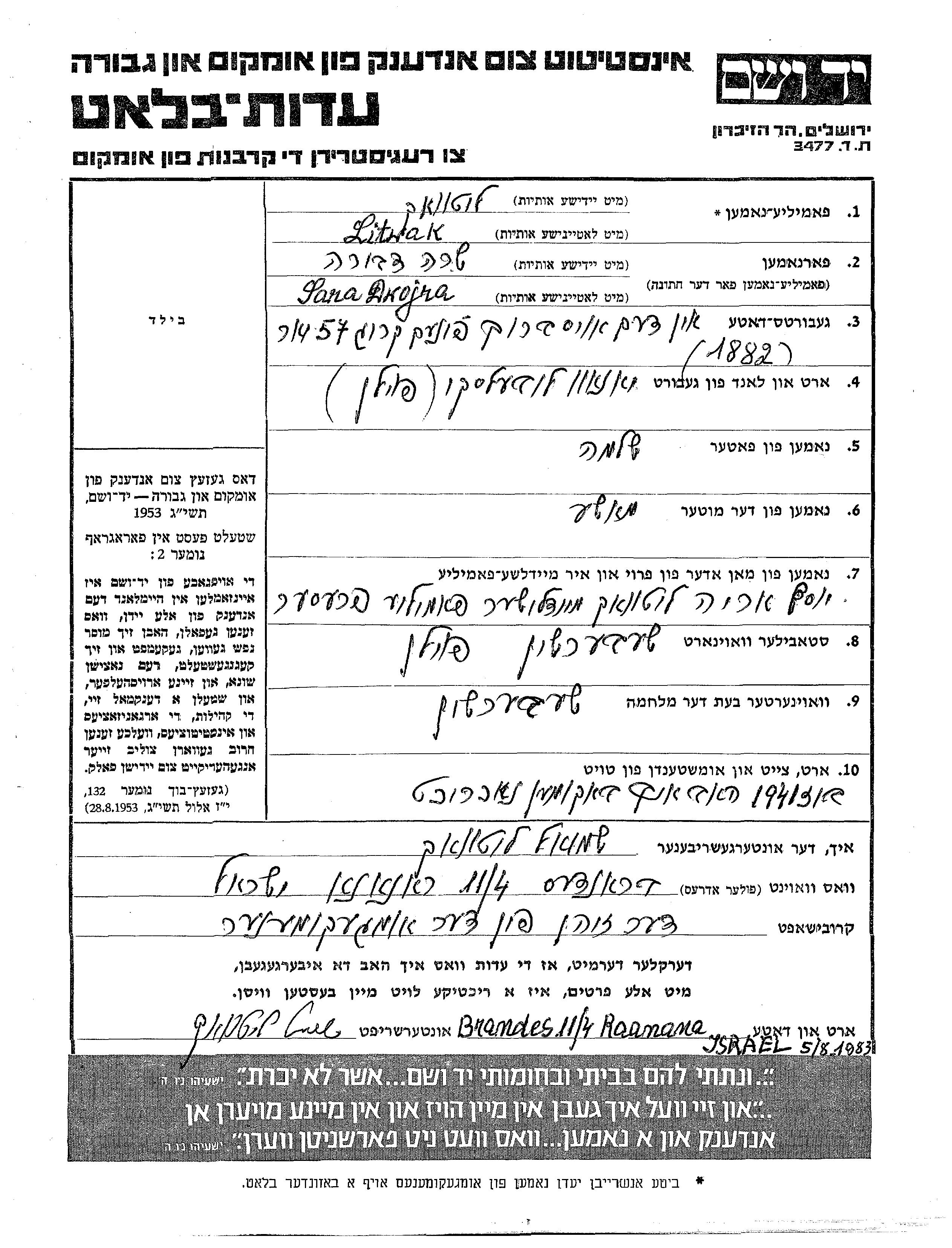 Dwojra Sara Litwak née Preser est née à Yanov Lyubelski, Pologne en 1882, fille de Shlomo et de Mashe. Avant la seconde guerre mondiale elle vivait à Sebersin, Pologne. Pendant la guerre, elle était à Sebersin, Pologne.