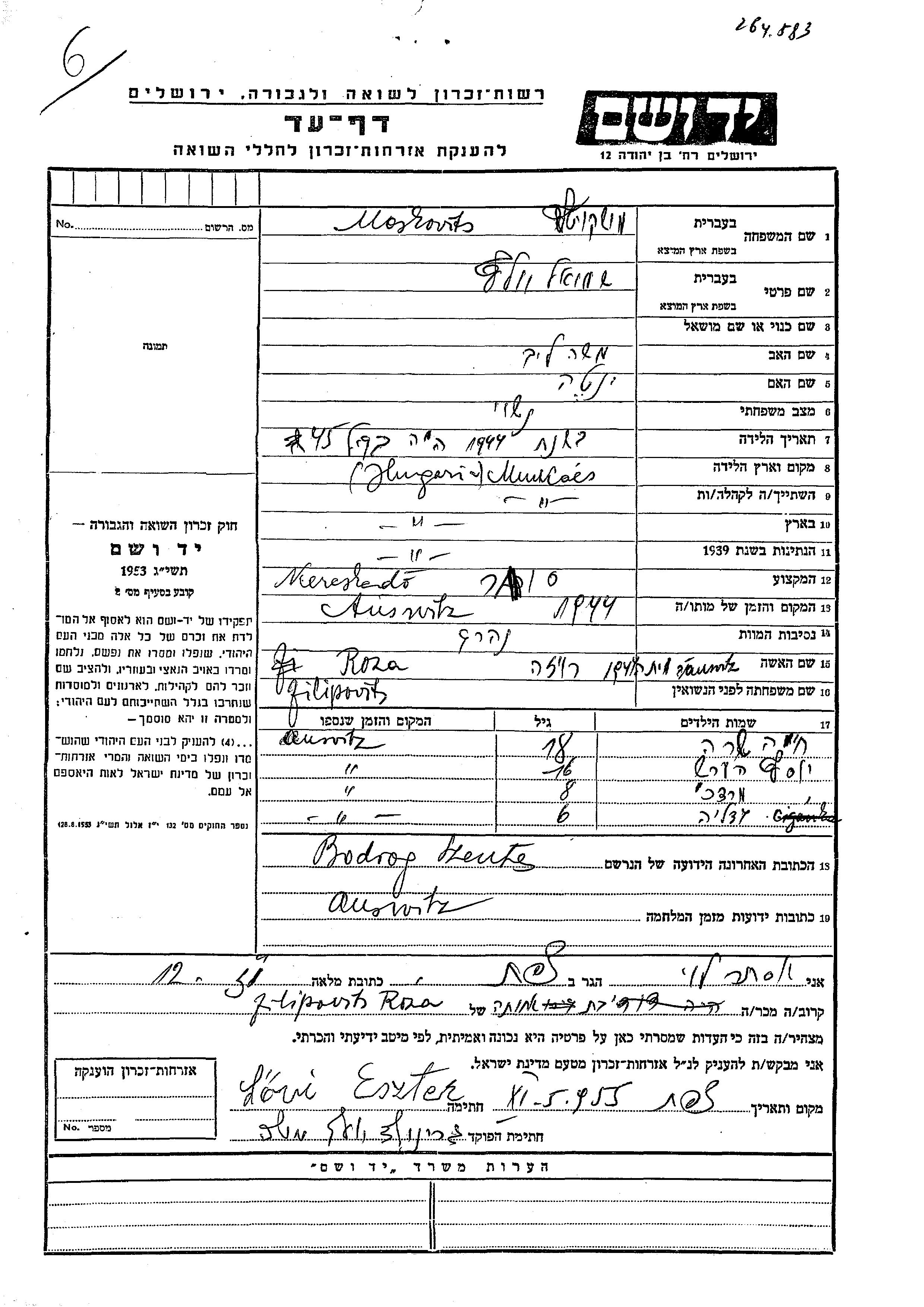 Moskovits Mordekhai endroit inconnu, Feuille de témoignage