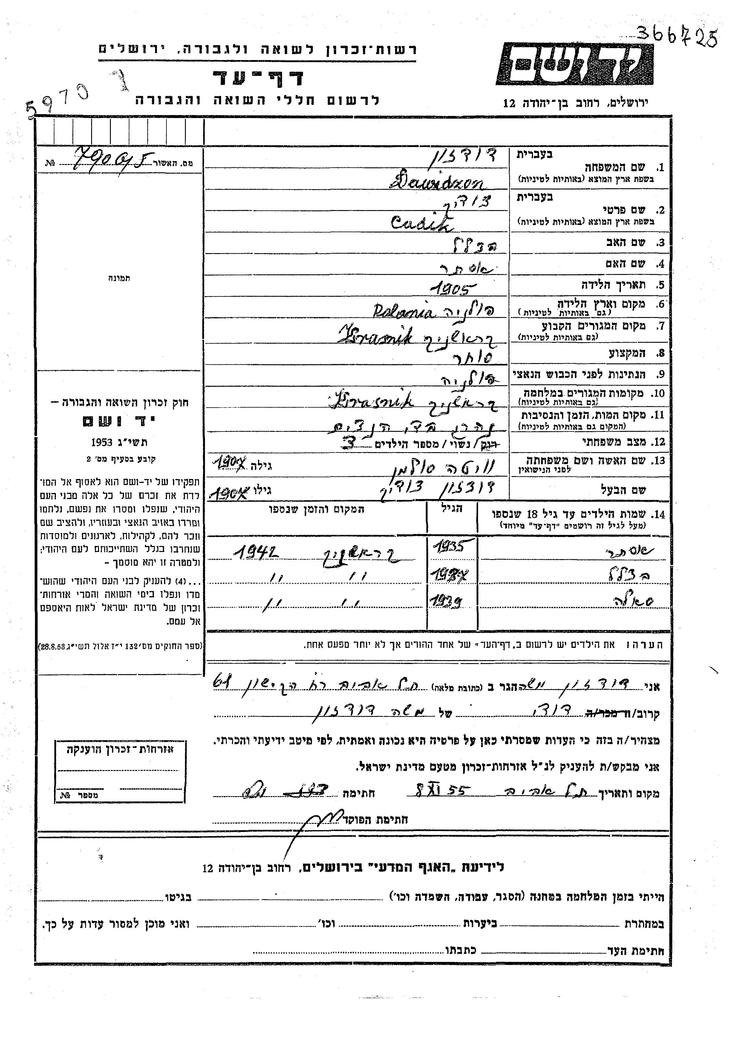 Dawidzon Betzalel 1937 Kraśnik, Pologne Feuille de témoignage