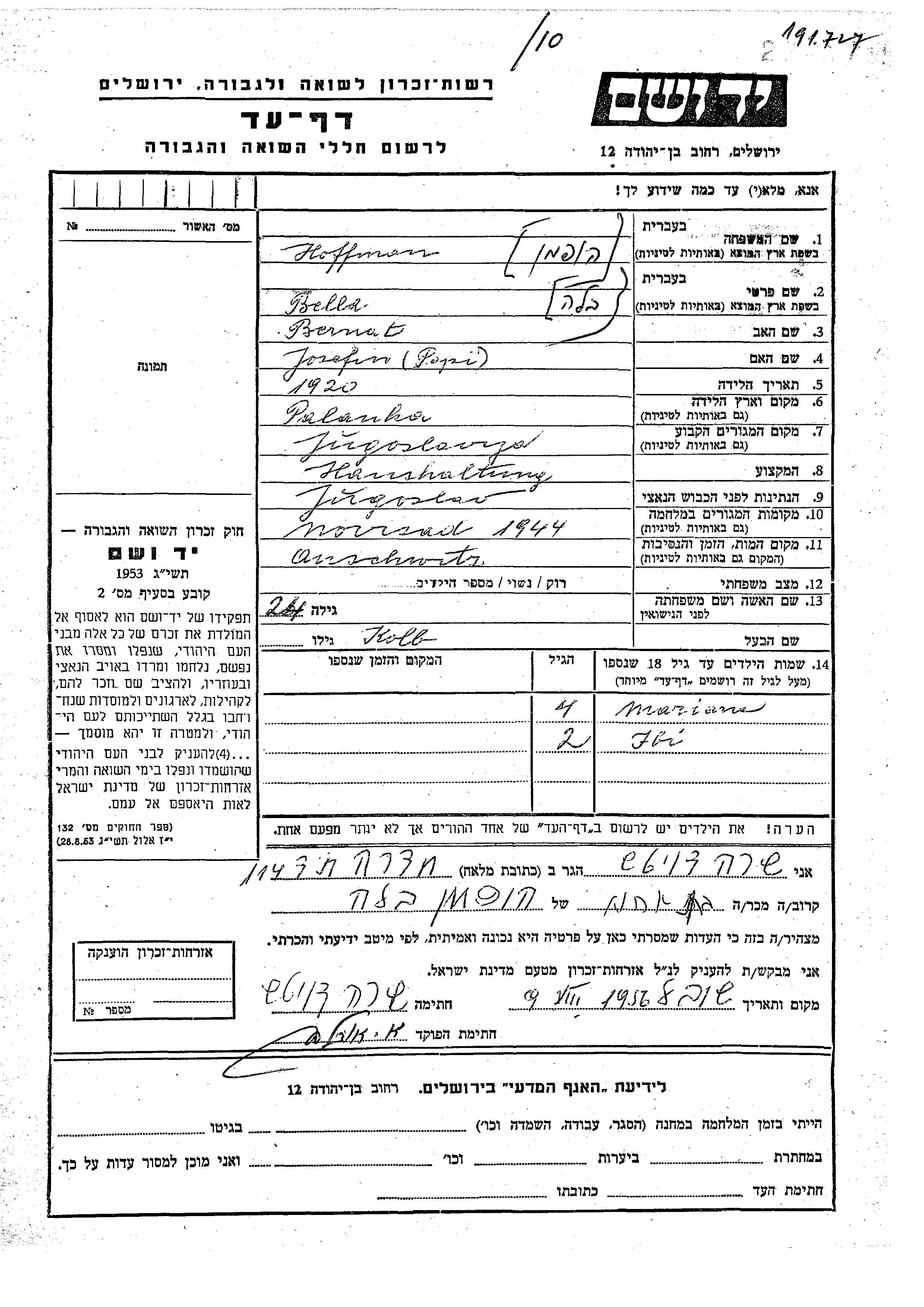 Hoffman Zvi Yugoslavie Feuille de témoignage