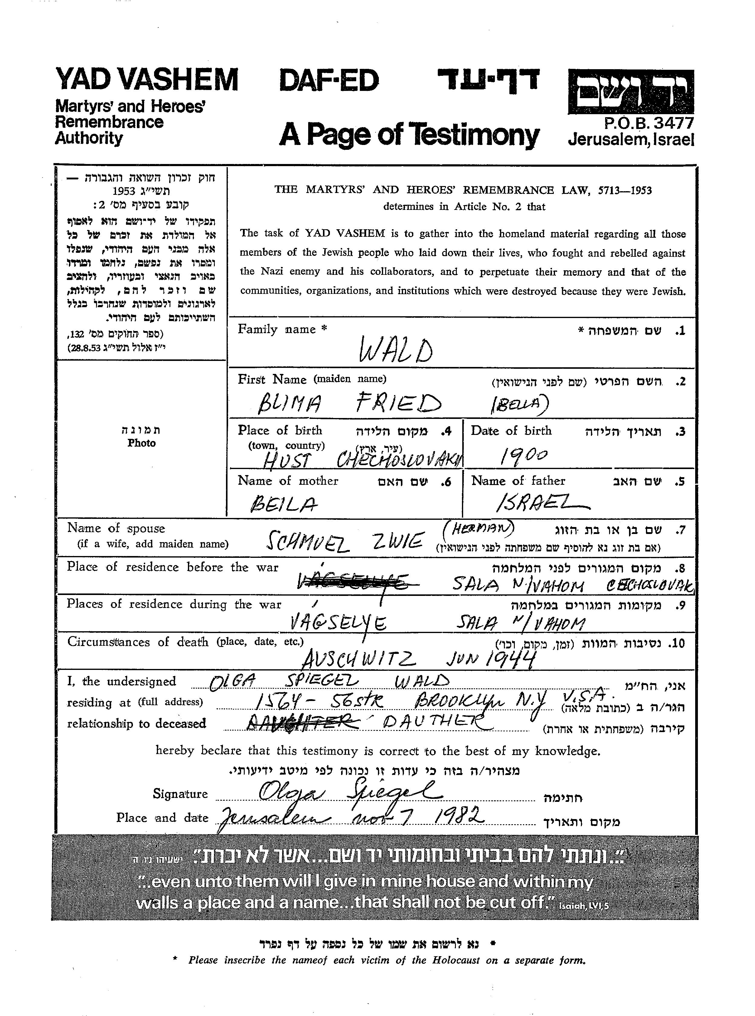 Blima Bella Wald née Fried est née à Hust, Tchécoslovaquie en 1900, fille de Israel et de Beila. Elle était Mariée à Schmuel Zwie. Avant la seconde guerre mondiale elle vivait à Sala nad Vahom, Tchécoslovaquie. Pendant la guerre, elle était à Sala nad Vahom, Tchécoslovaquie.