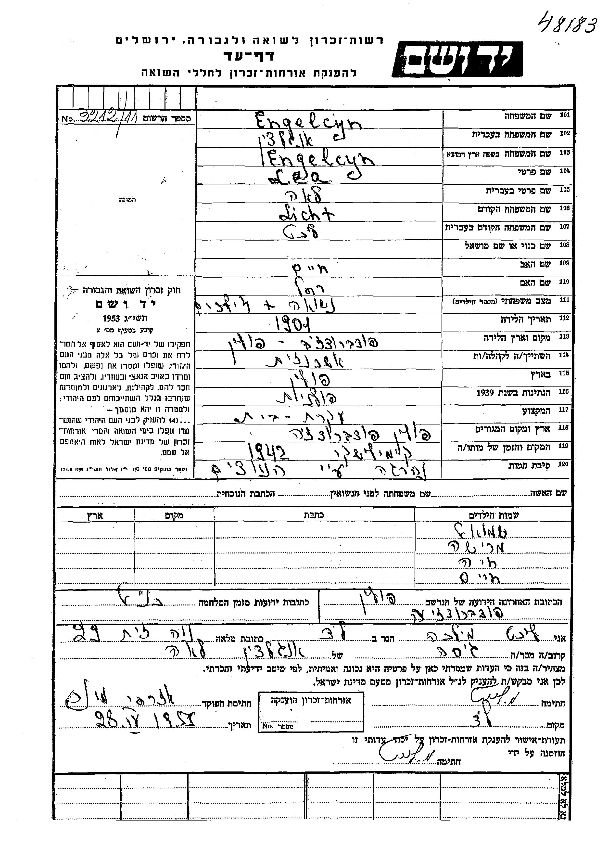 Engelcyn Shmuel Podbrodzie, Pologne Feuille de témoignage