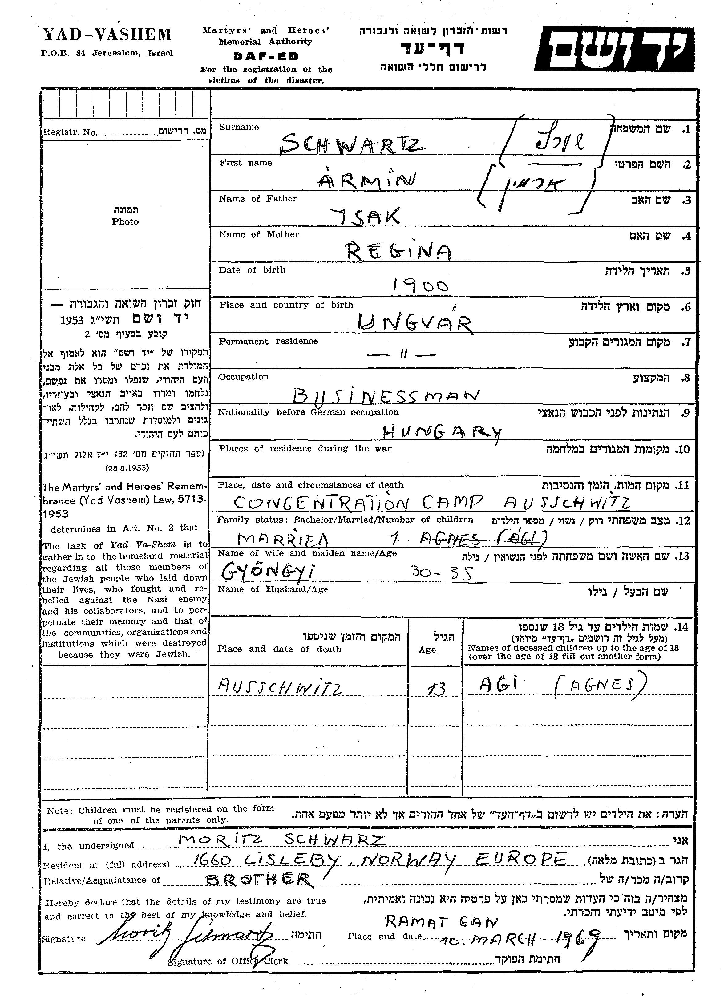 Schwartz Agi Ungvar, Tchécoslovaquie Feuille de témoignage
