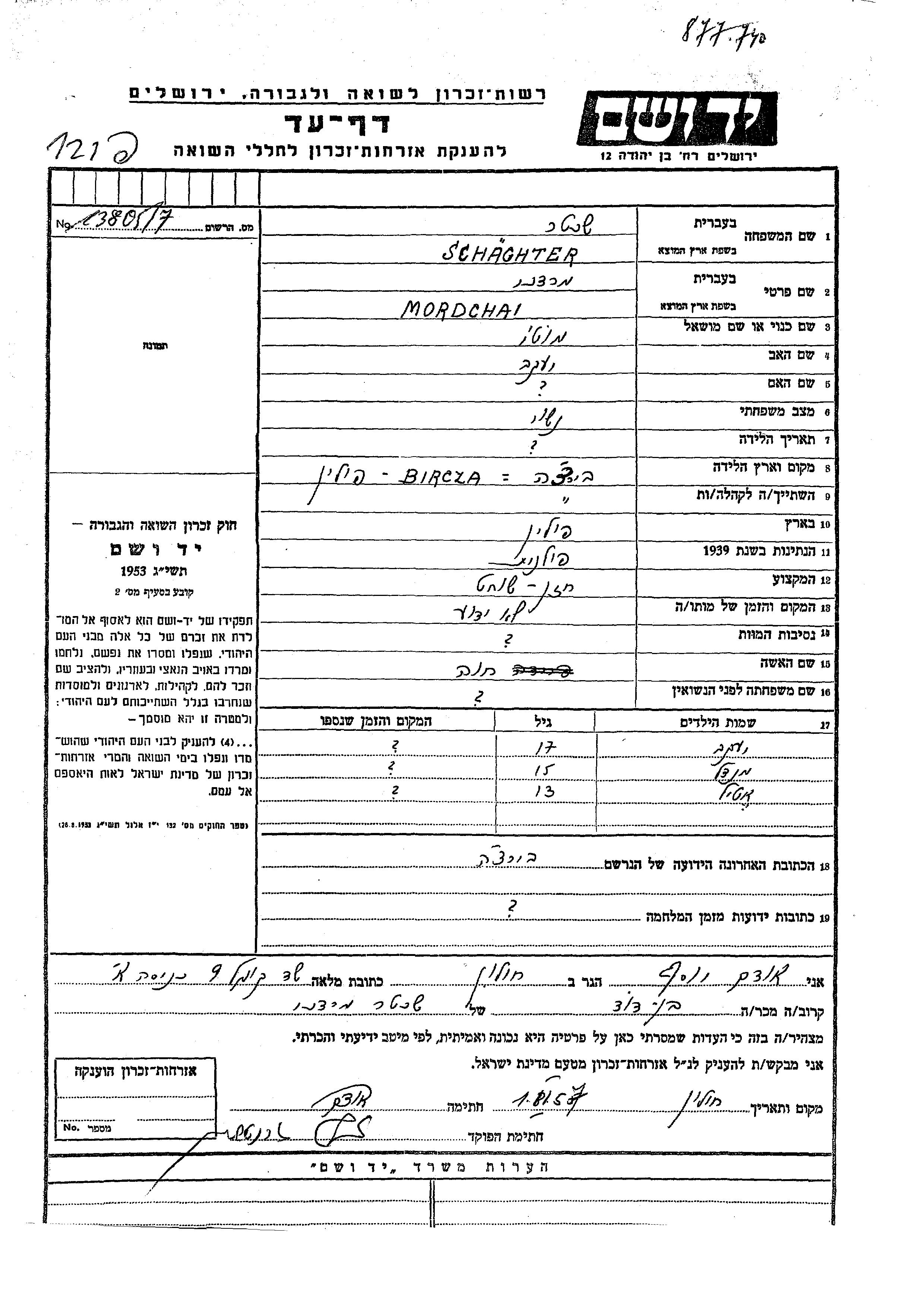 Schaeghter Yaakov Bircza, Pologne Feuille de témoignage
