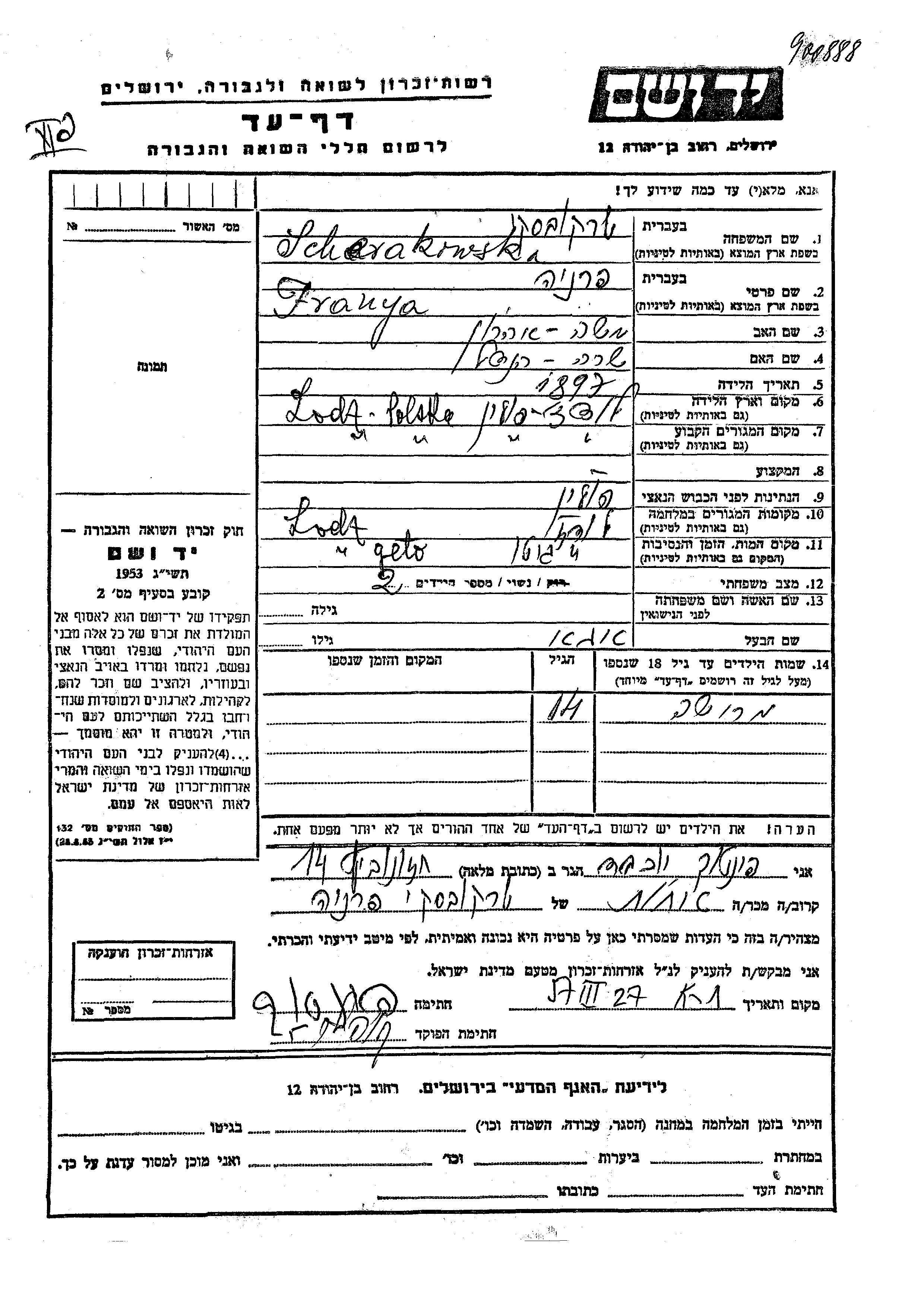 Scherakowska Sherakovski Marisha Lodz, Pologne Feuille de témoignage