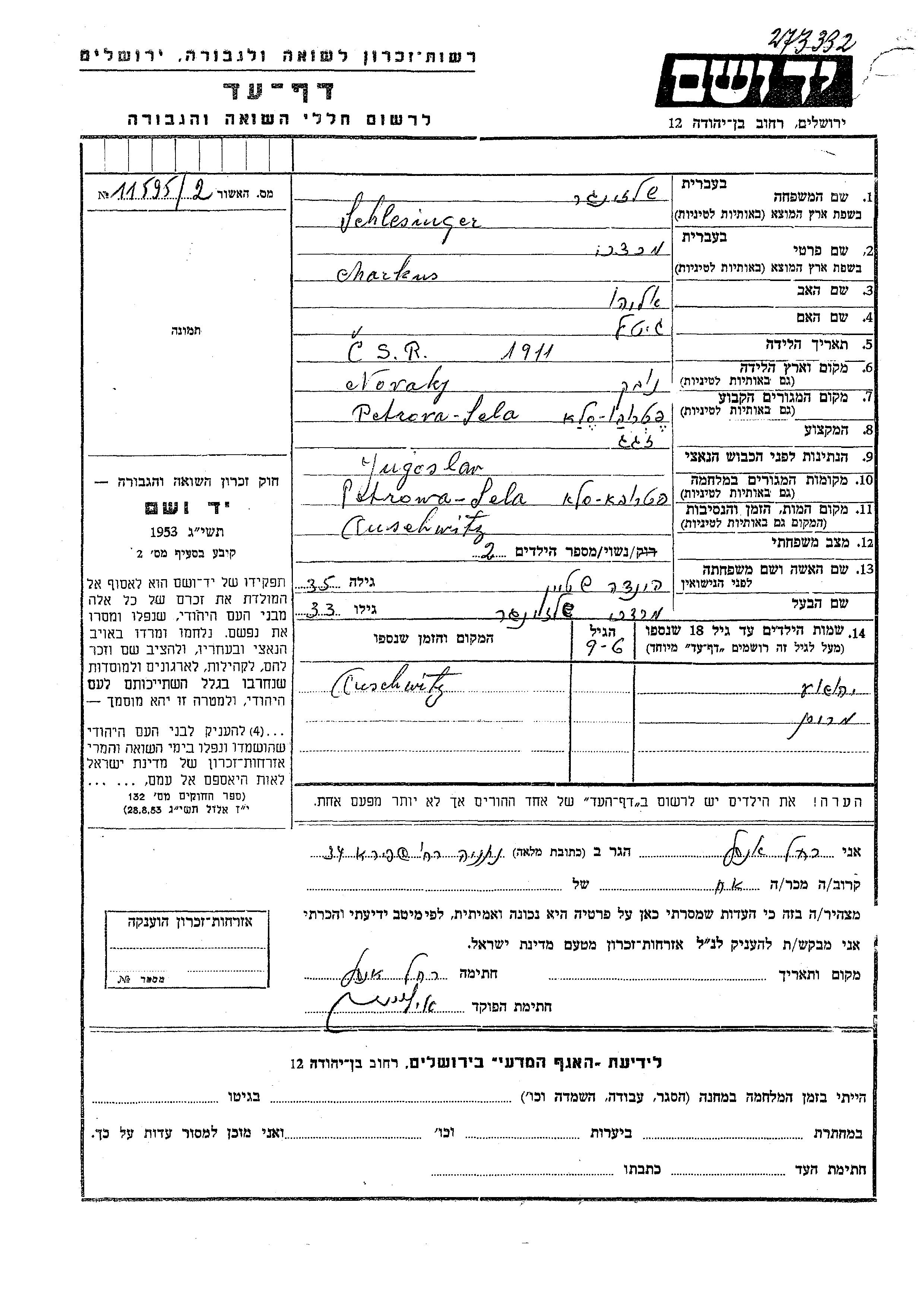 Schlesinger Yehoshua Petrovo Selo, Yugoslavie Feuille de témoignage