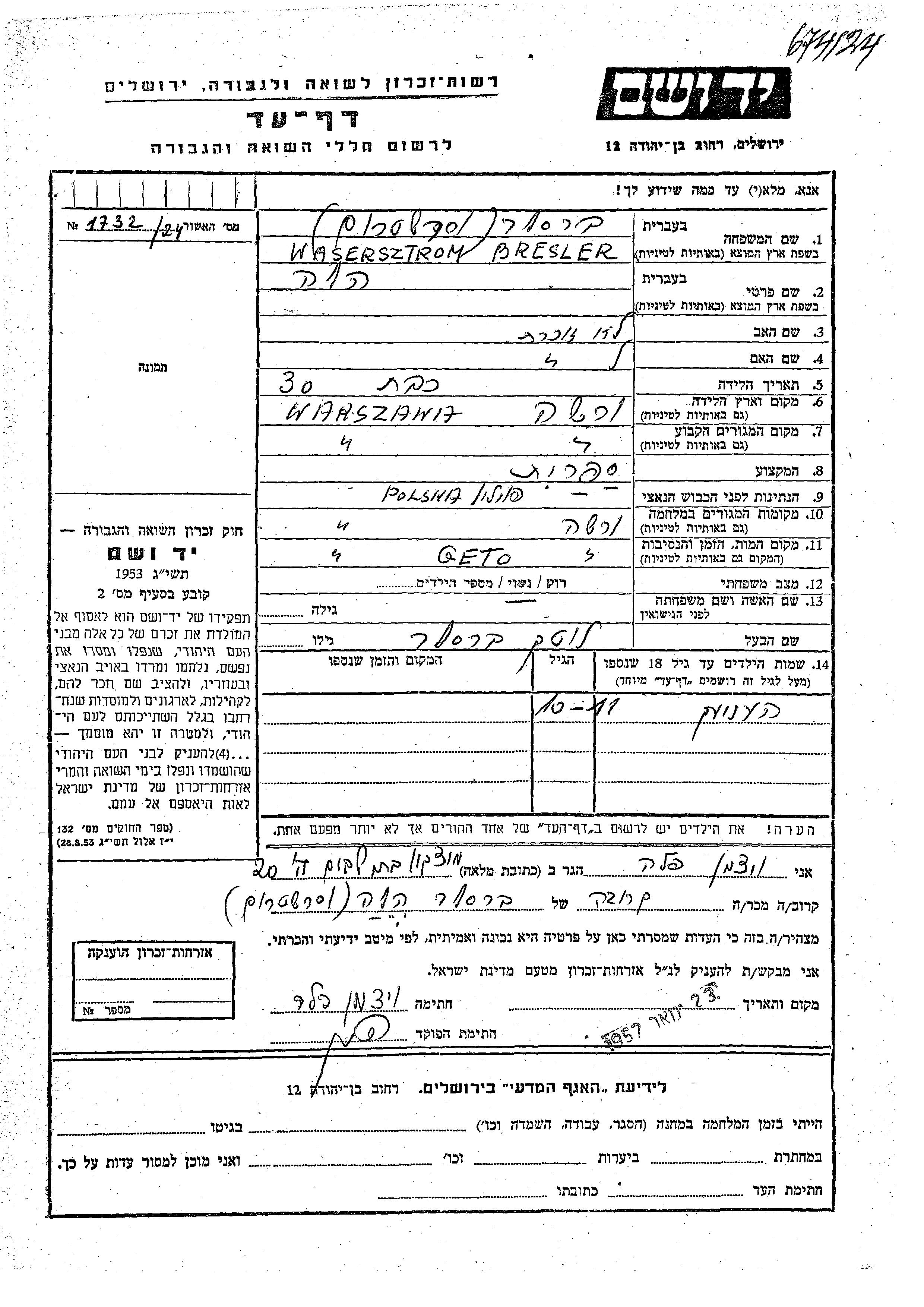 Wasersztrom Bresler Hela Warsaw, Pologne Feuille de témoignage