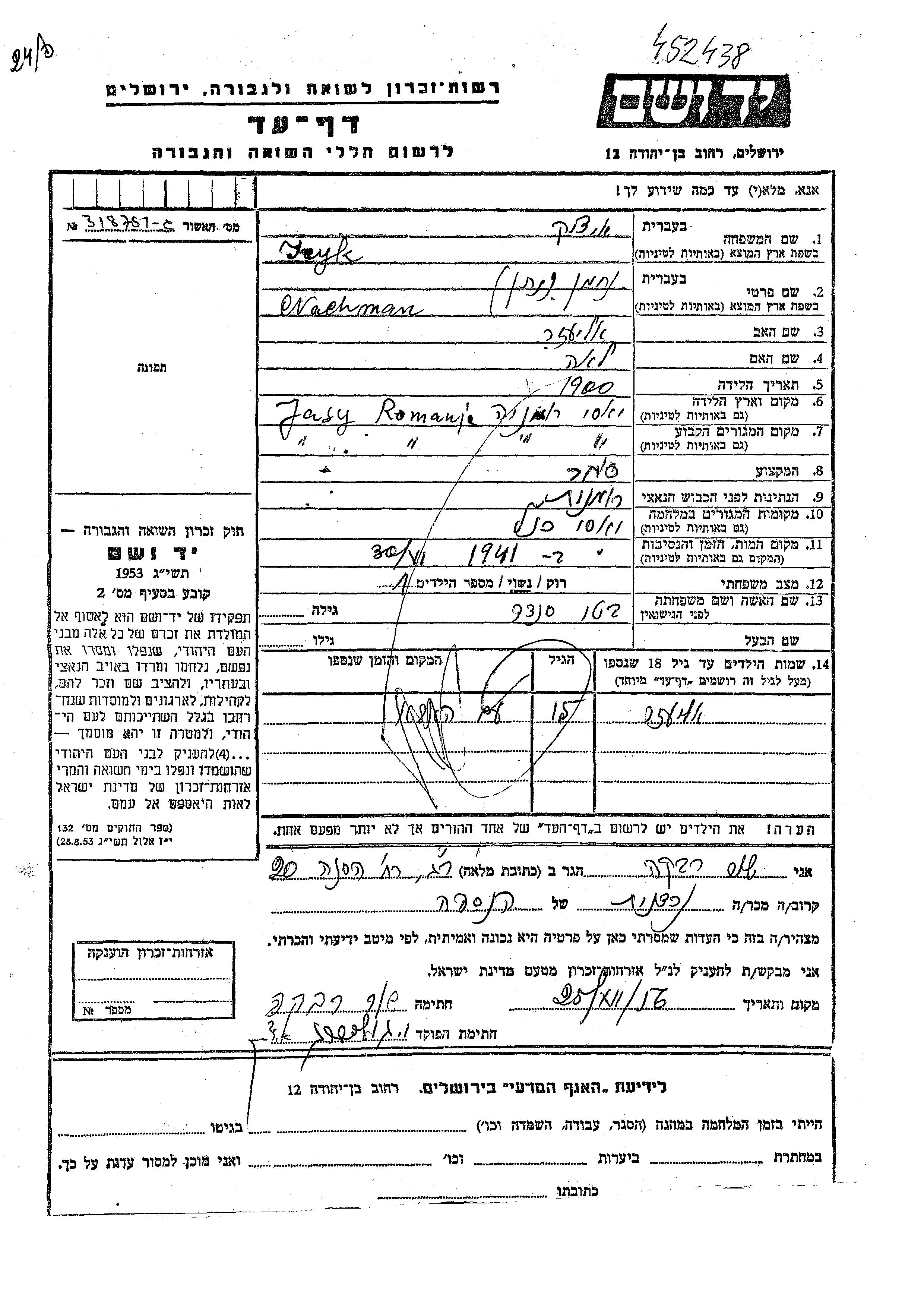 Icyk Eliezer Jassy, Roumanie Feuille de témoignage
