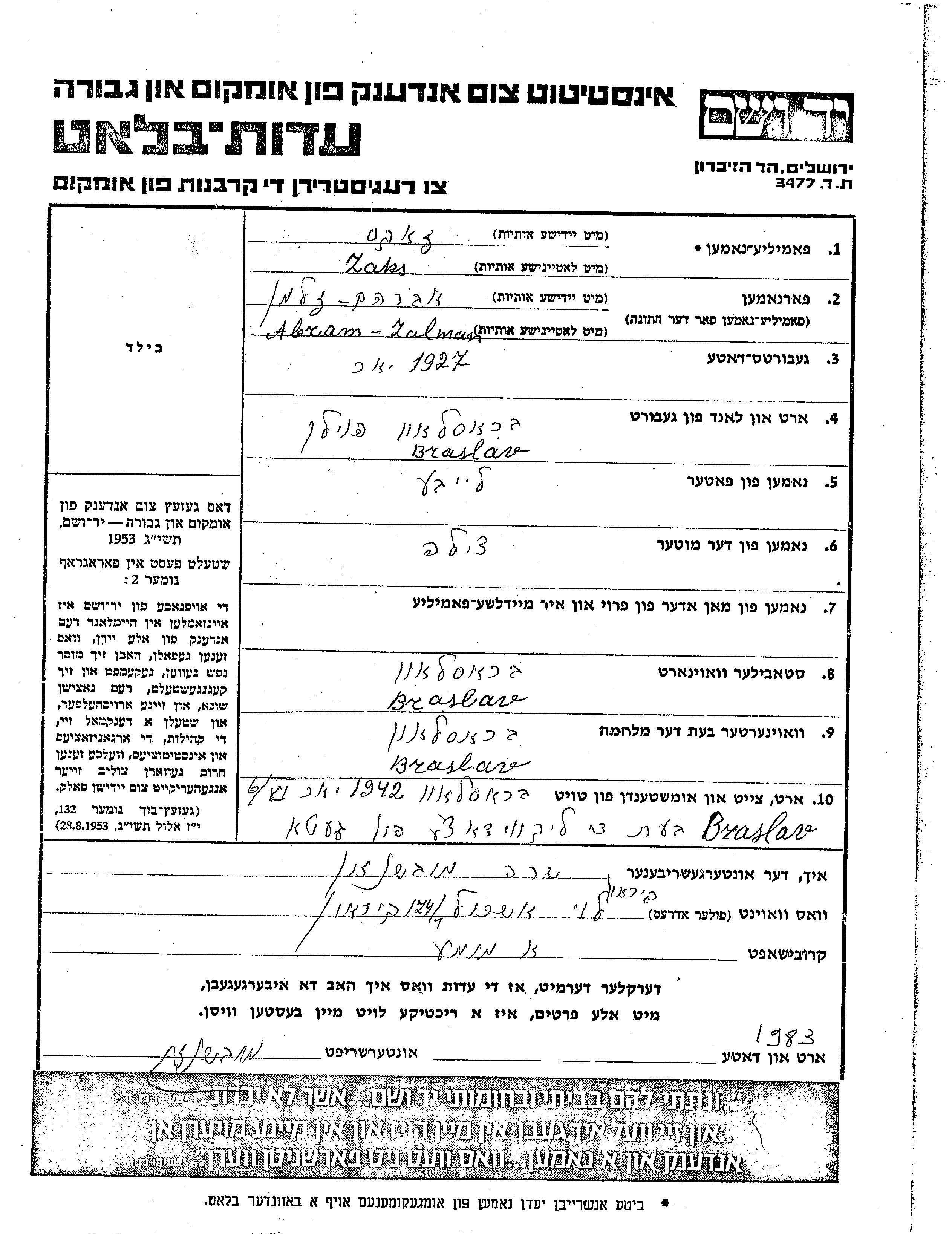 Zaks Abram Zalman 1927 Braslaw, Pologne Feuille de témoignage