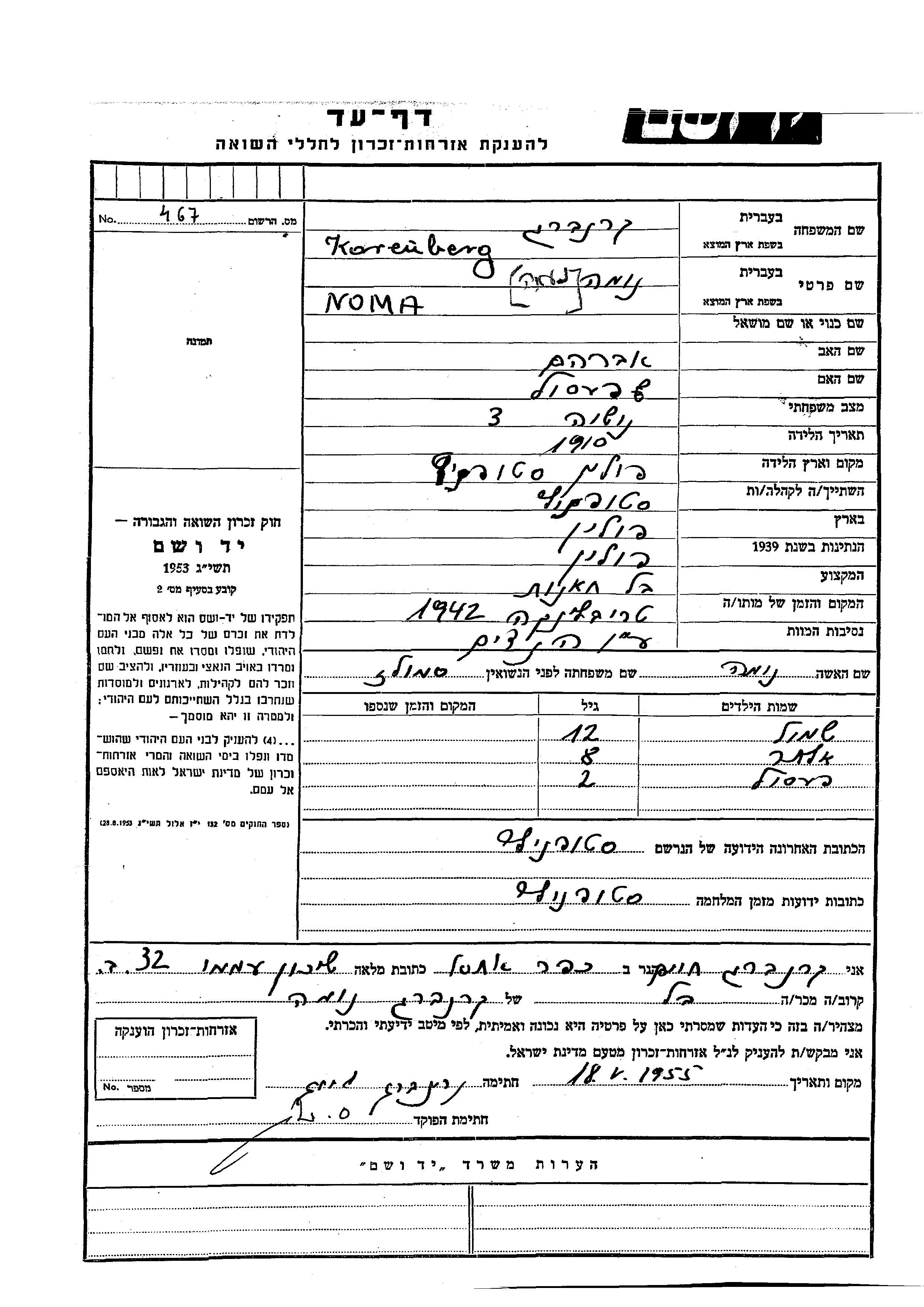 Shmul Korenberg Kernberg est né fils de Khaim et de Noma Naama née Smolash. Il était Enfant. Avant la seconde guerre mondiale il vivait à Stopnica, Pologne. Au cours de la guerre, il était à Stopnica, Pologne.