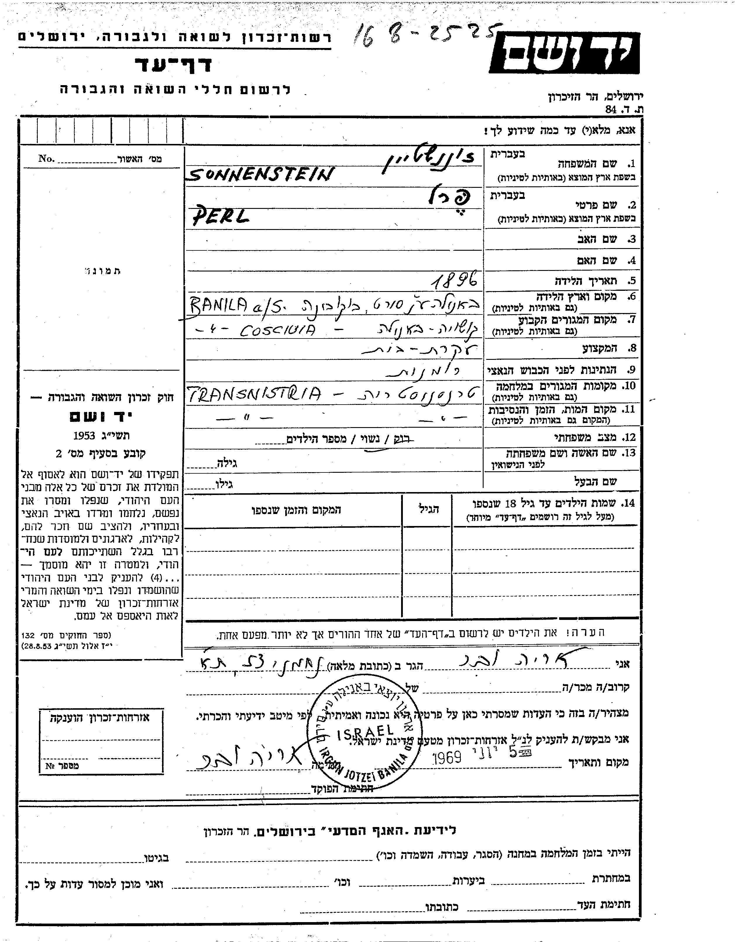 Perl Sonnenstein est née à Banila Siret, Roumanie en 1896. Elle était Femme au foyer et Mariée. Avant la seconde guerre mondiale elle vivait à Banila, Roumanie. Pendant la guerre, elle était à Transnistria, Ukraine (URSS).