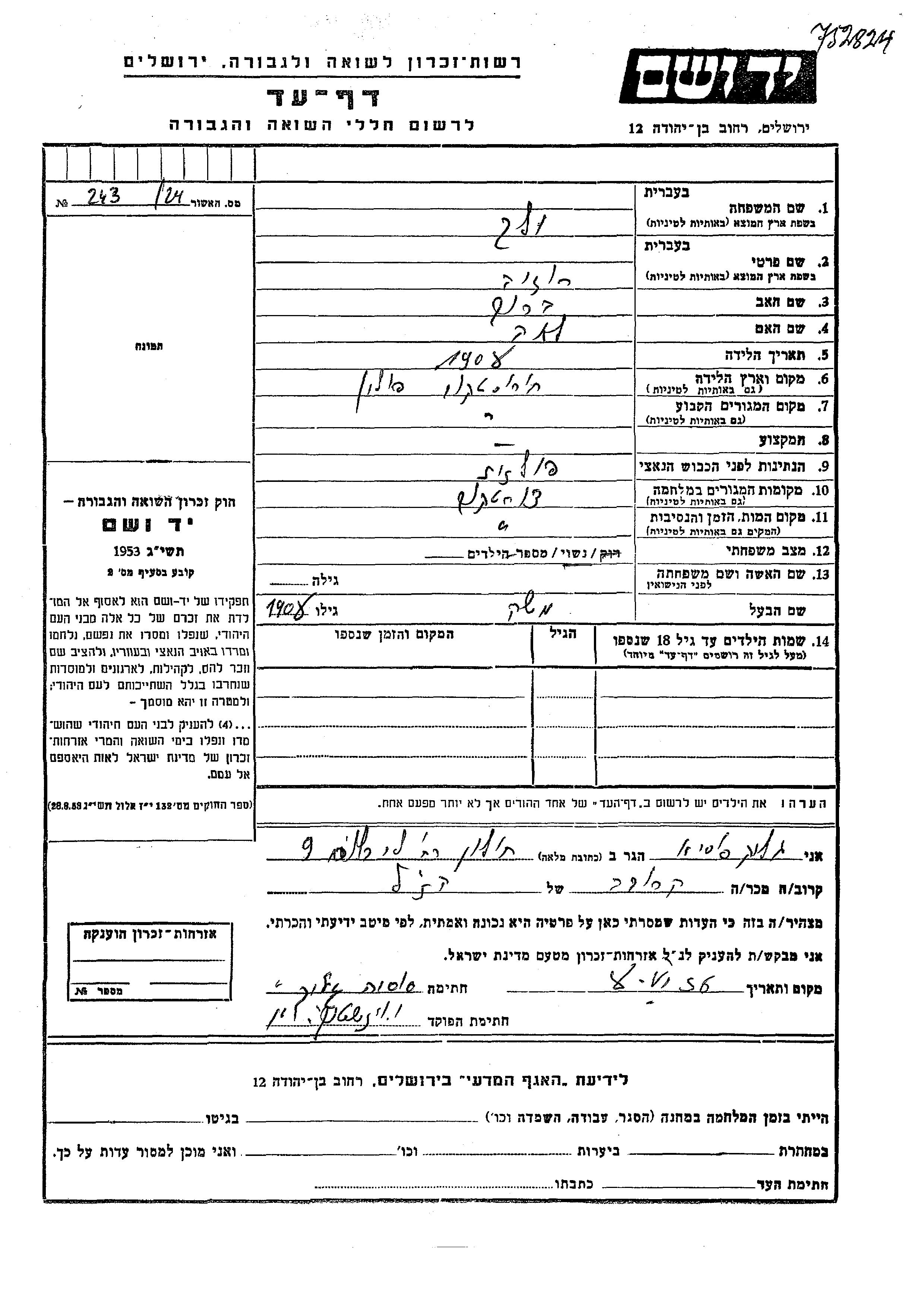 Yad Vashem - Pages of Testimony Names Memorial Collection