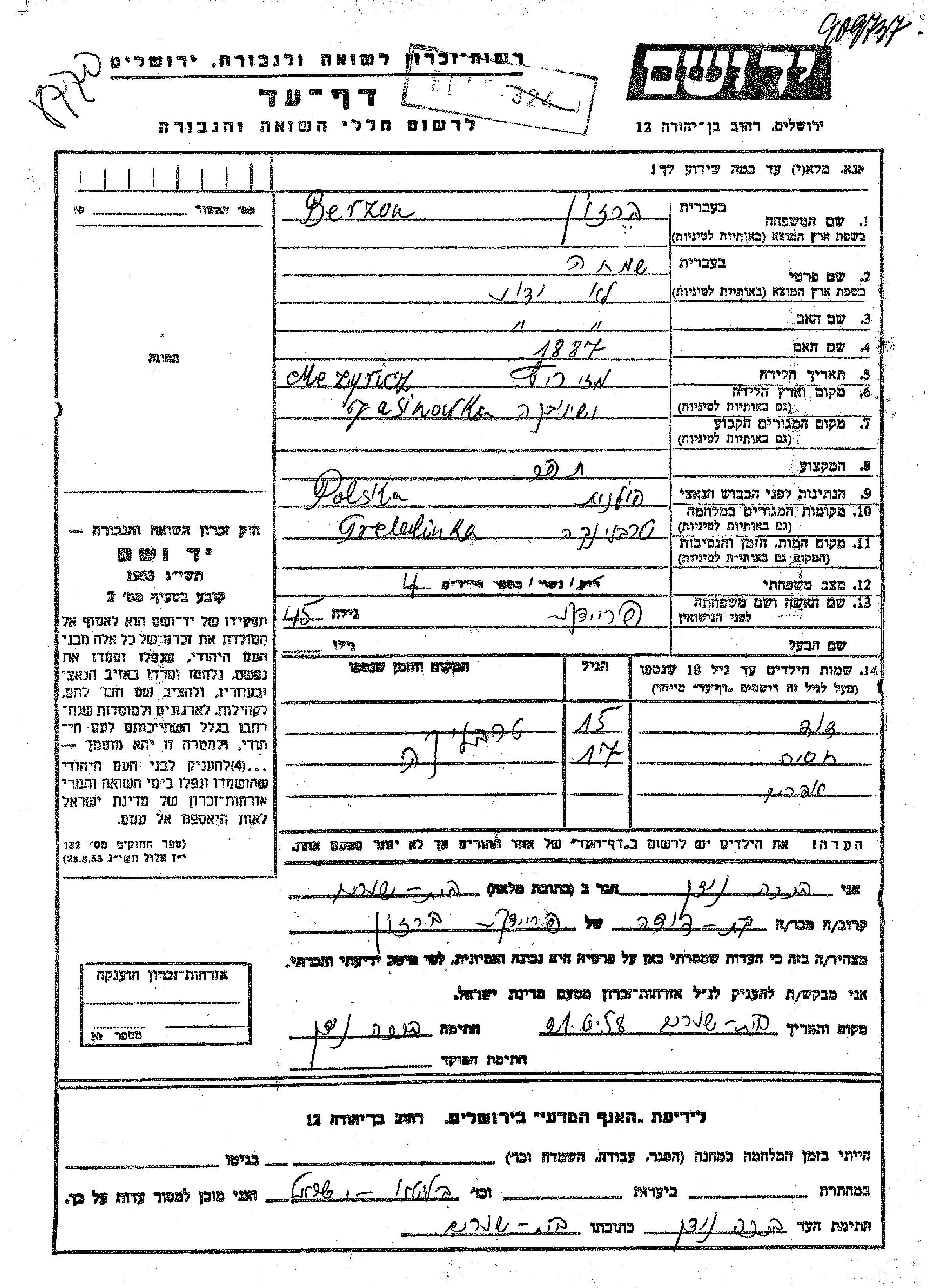 Berzon Efraim Jasionowka, Pologne Feuille de témoignage