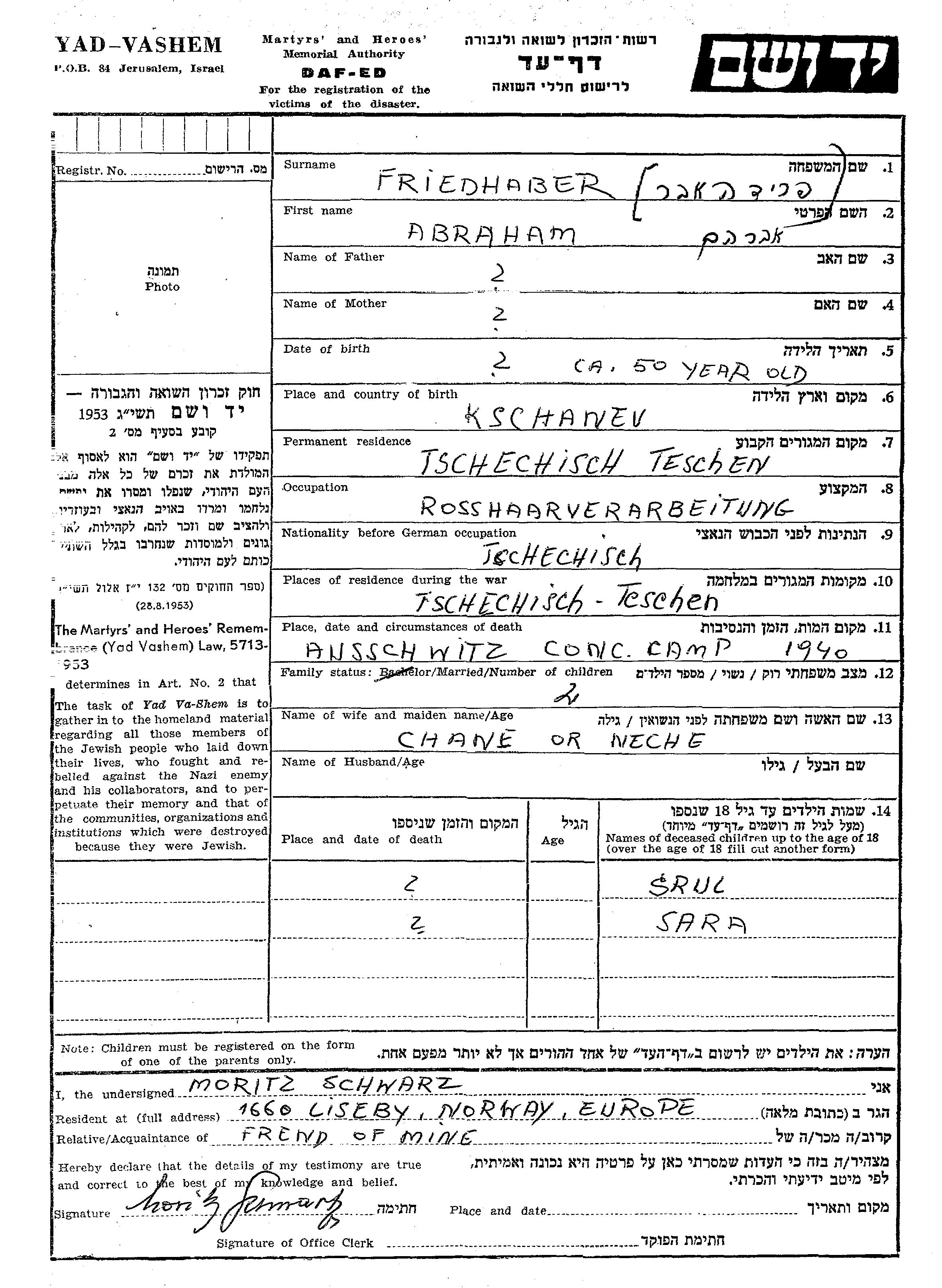 Friedhaber Sara Teschen, Feuille de témoignage