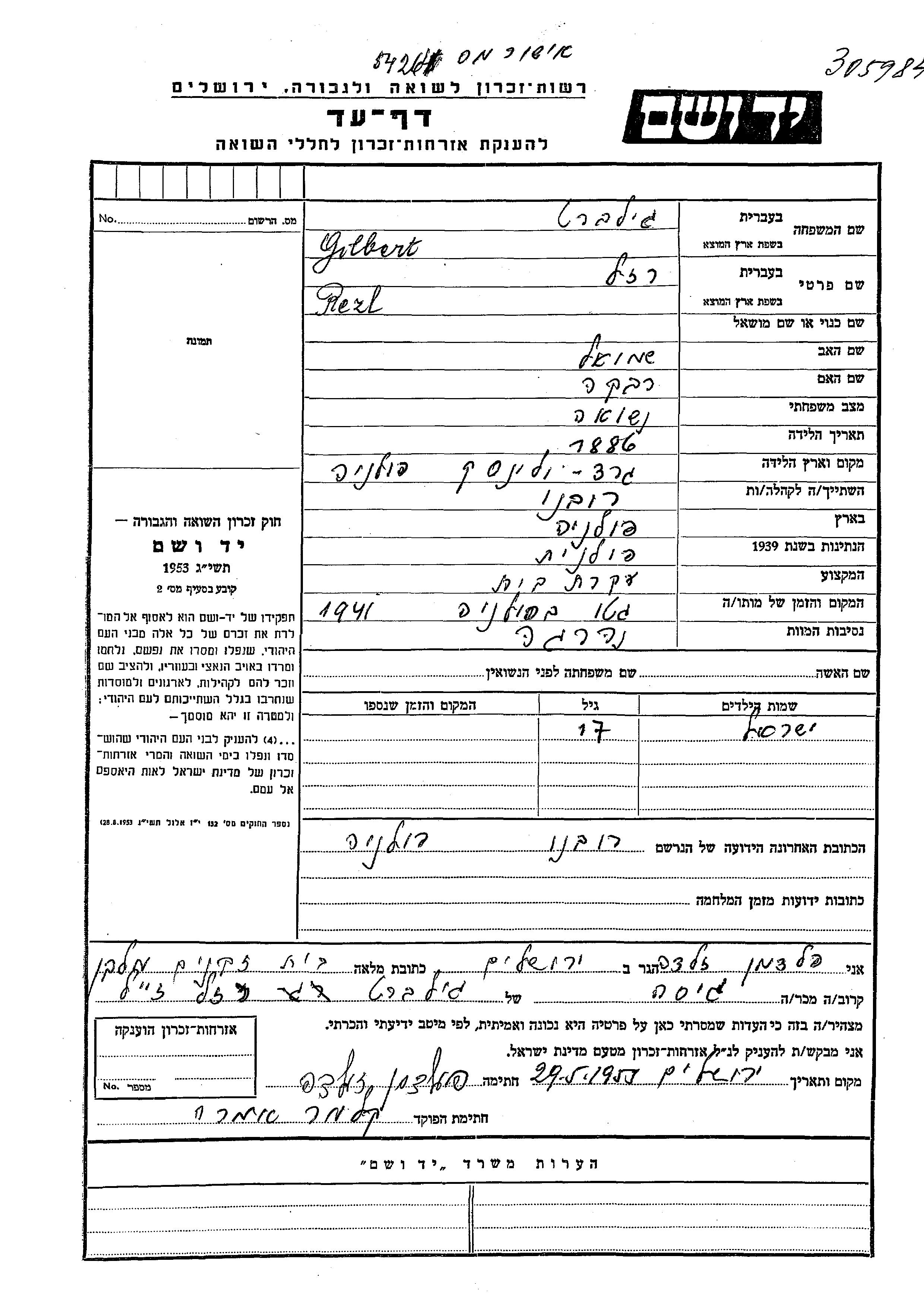 Yisrael Gilbert est né fils de Rezl. Il était Enfant. Avant la seconde guerre mondiale il vivait à Rowne, Pologne. Au cours de la guerre, il était à Rowne, Pologne.